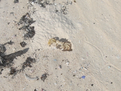 Fortunately, the beachcombing goddess “Seabenia” took pity on me and I easily found several beans and one curious sand crab who didn’t know or care about the time.