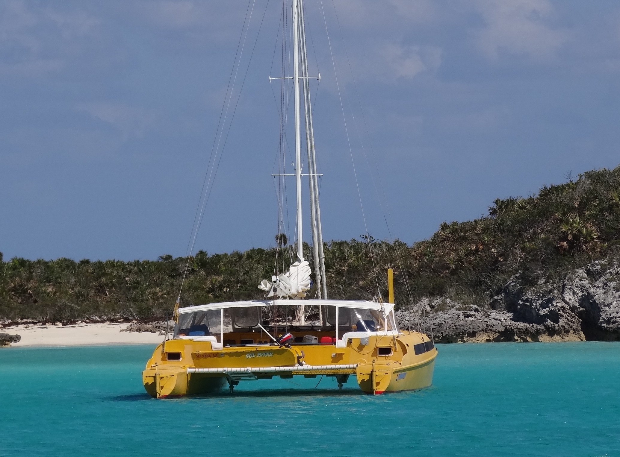 And run we did; the course change improved our angle to the wind and we sped along over 8kts, the ever-increasing waves at our stern not bothering us any. Other than trying to get a slip at Hawk’s Nest Marina on Cat Island our only other option was to get over to the Exuma chain, go in a safe cut and find a protected spot. We heard another boat going into Hawk’s Nest but we nixed that figuring not many marinas have much space for cats and did we want to blow the dockage budget anyway? Our excellent heading would take us to the excellent Little Farmer’s Cut; perfect. Anchored by 5:30, a 70nm day behind us, and the next day we’d head 30nm north to try for a mooring at Cambridge Cay (in the ECLSP) with a backup anchoring spot behind Bell Island.