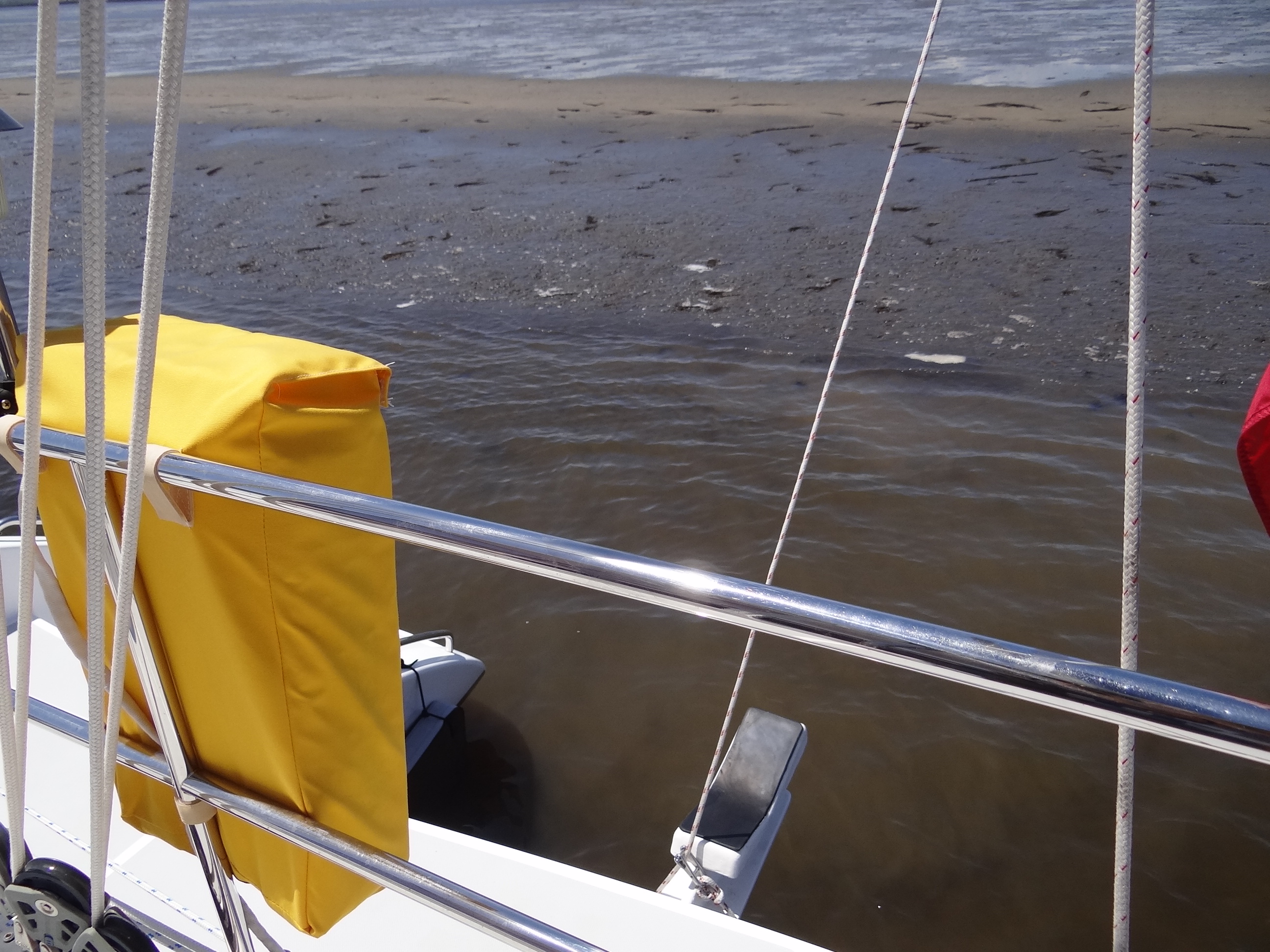However, we really felt like idiots when we saw Ortolan stern-to the mud shoal; the wind had shifted and we’d swung toward it rather than parallel. Depth was 12’ when we’d anchored on Sunday at mid-tide. And we were fine- hey two other cats had anchored in line ahead of us, but guess who had more scope out? Pulled in much of the chain and since no wind was forecast we decided to be lazy and stay put. Still had a few things to do ashore and re-anchoring would cut into that time.