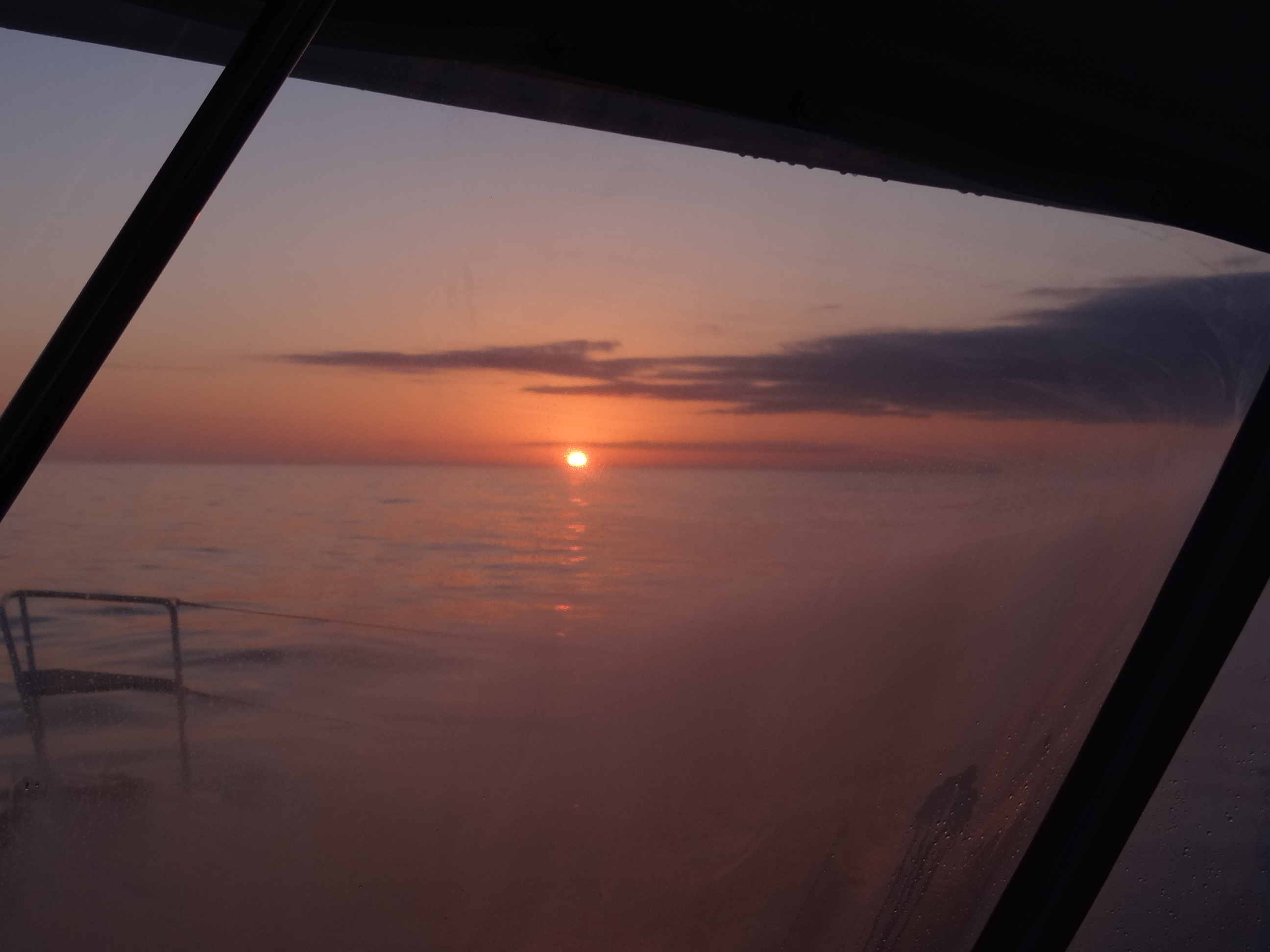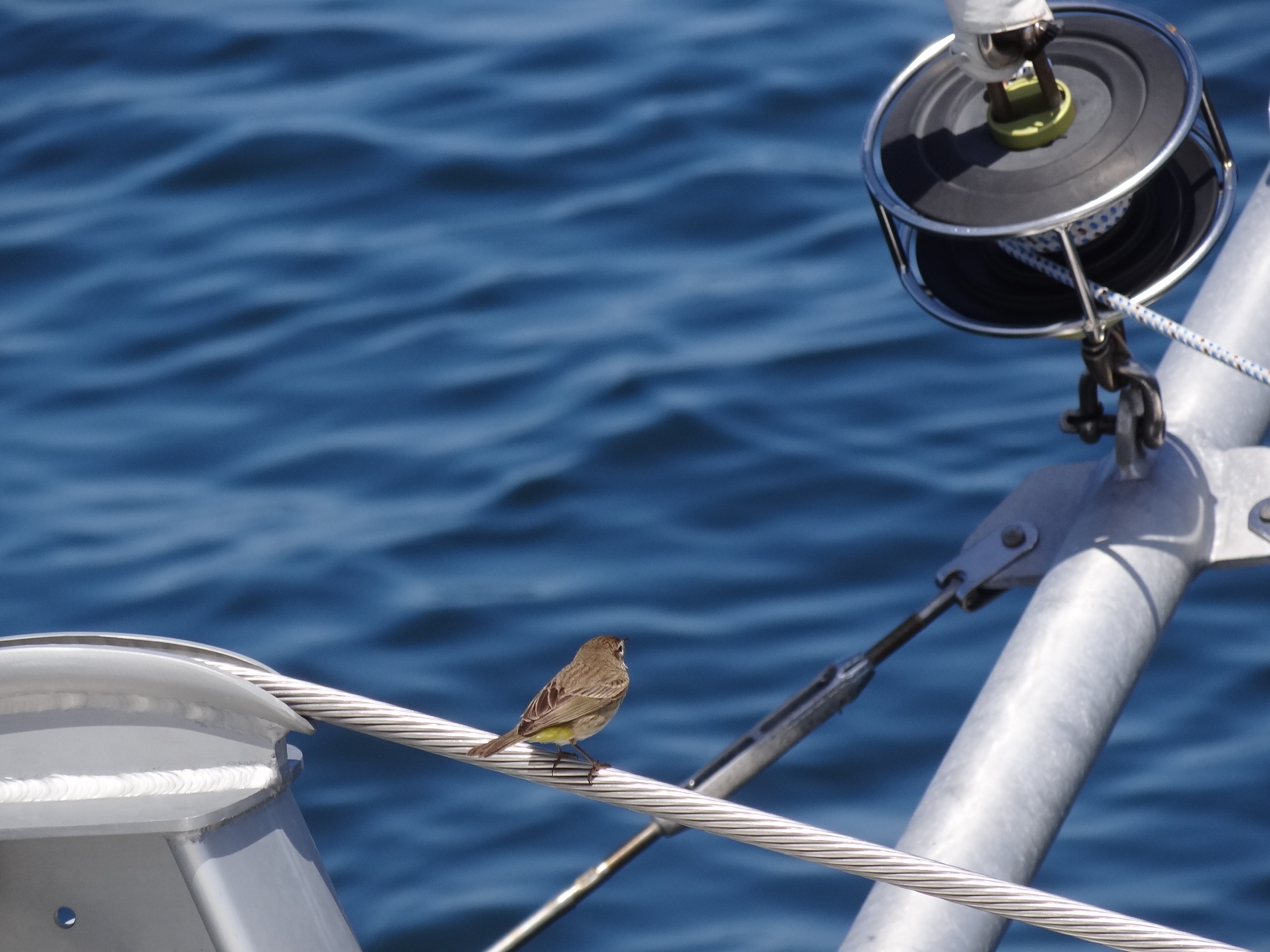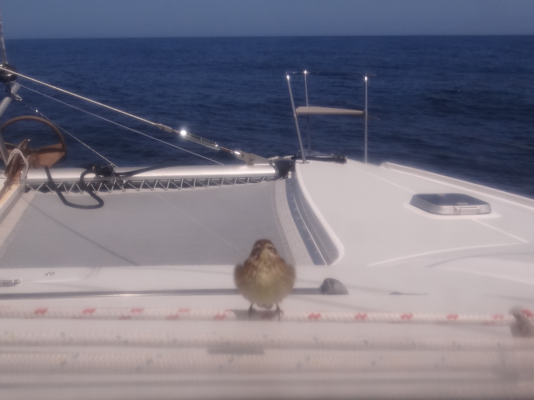 Every time we make an overnight jump offshore, a feathered visitor stops by. The photo on the right was taken through the Strataglass, so kinda hazy.