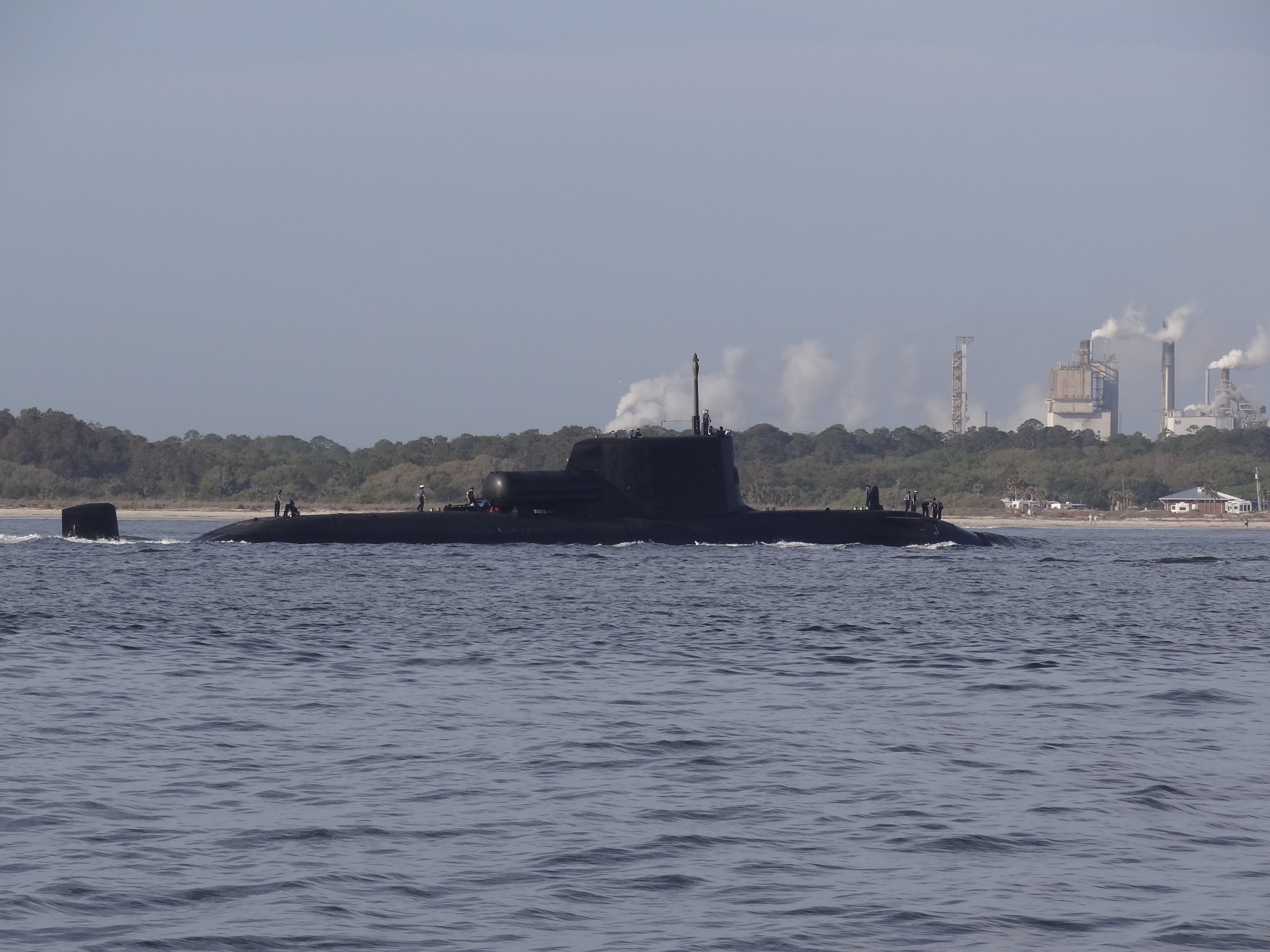 An even better “good”, was an event we didn’t expect to witness. No sorry, not a whale sighting, although the Coast Guard announces the “right whale” warning with an aggravating frequency, but a whale of a submarine! The one we’d heard of on Monday, apparently had gone out and now was returning as we motored out Cumberland Sound/St Mary’s channel into the Atlantic. What a splendid and unique sight. Vessels are required to keep 500 yds away so we made sure to be outside the channel.