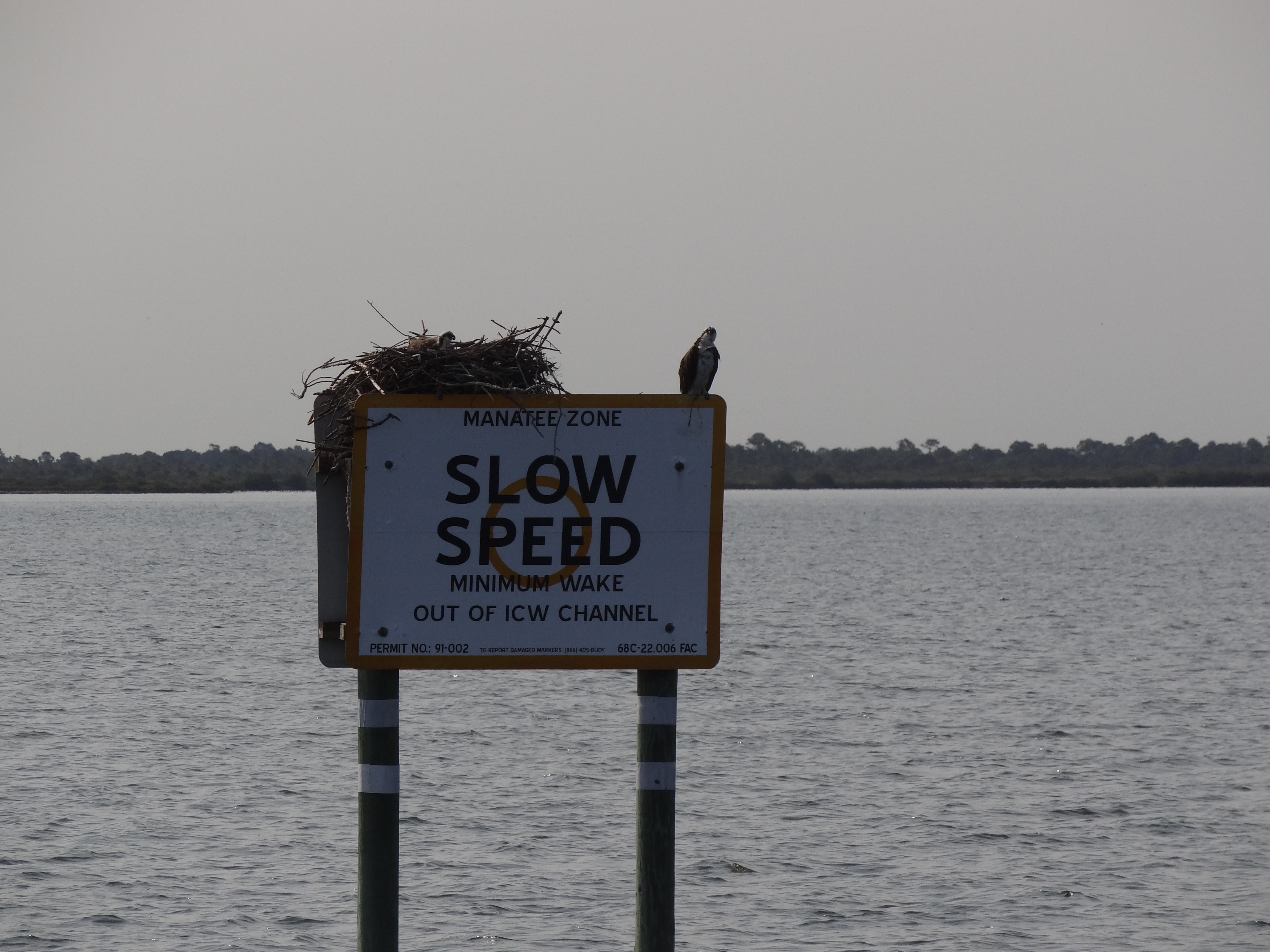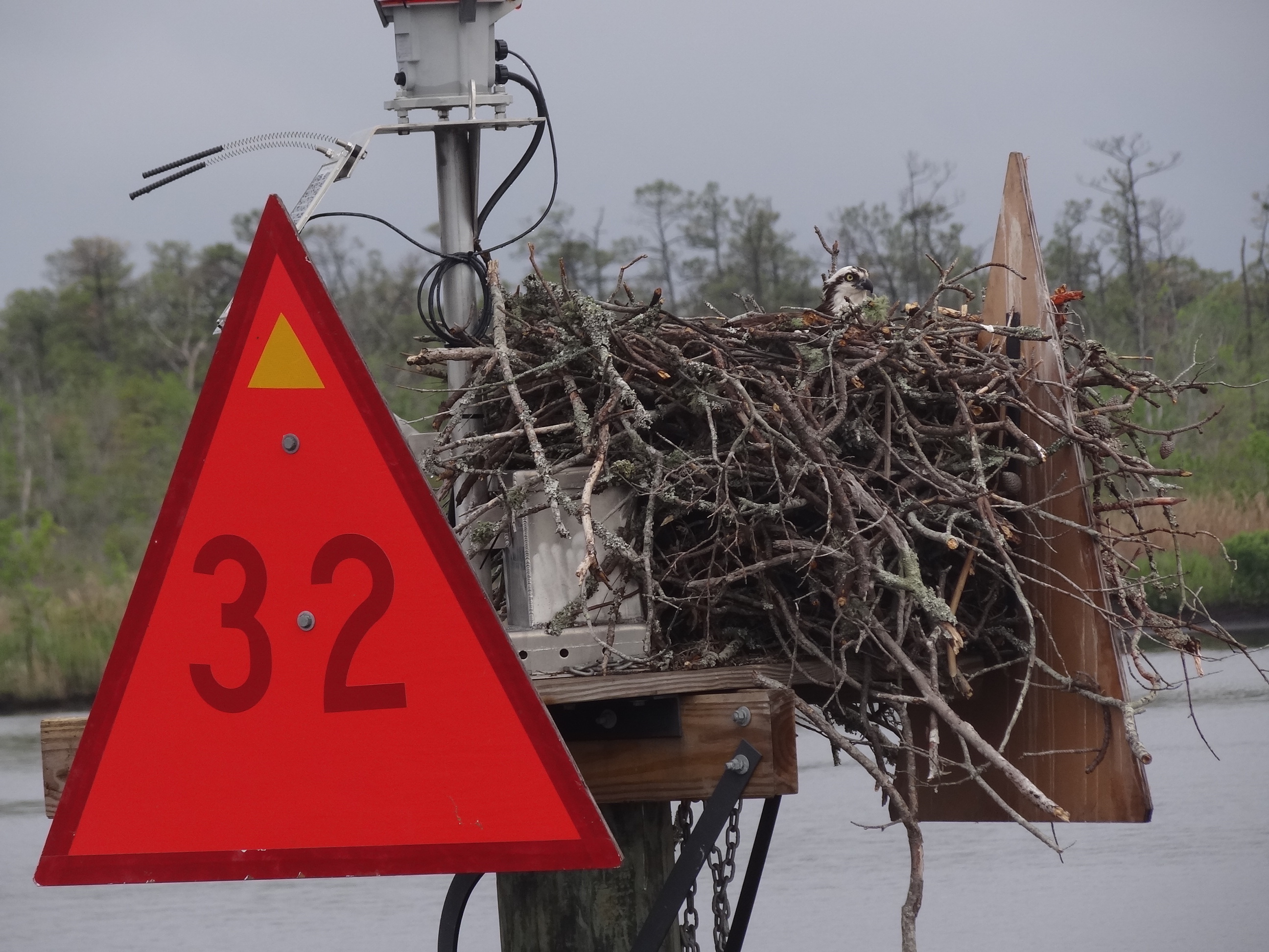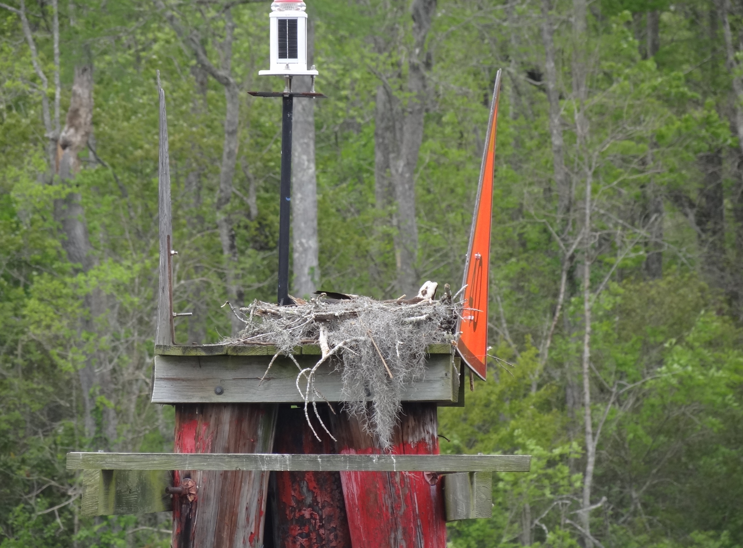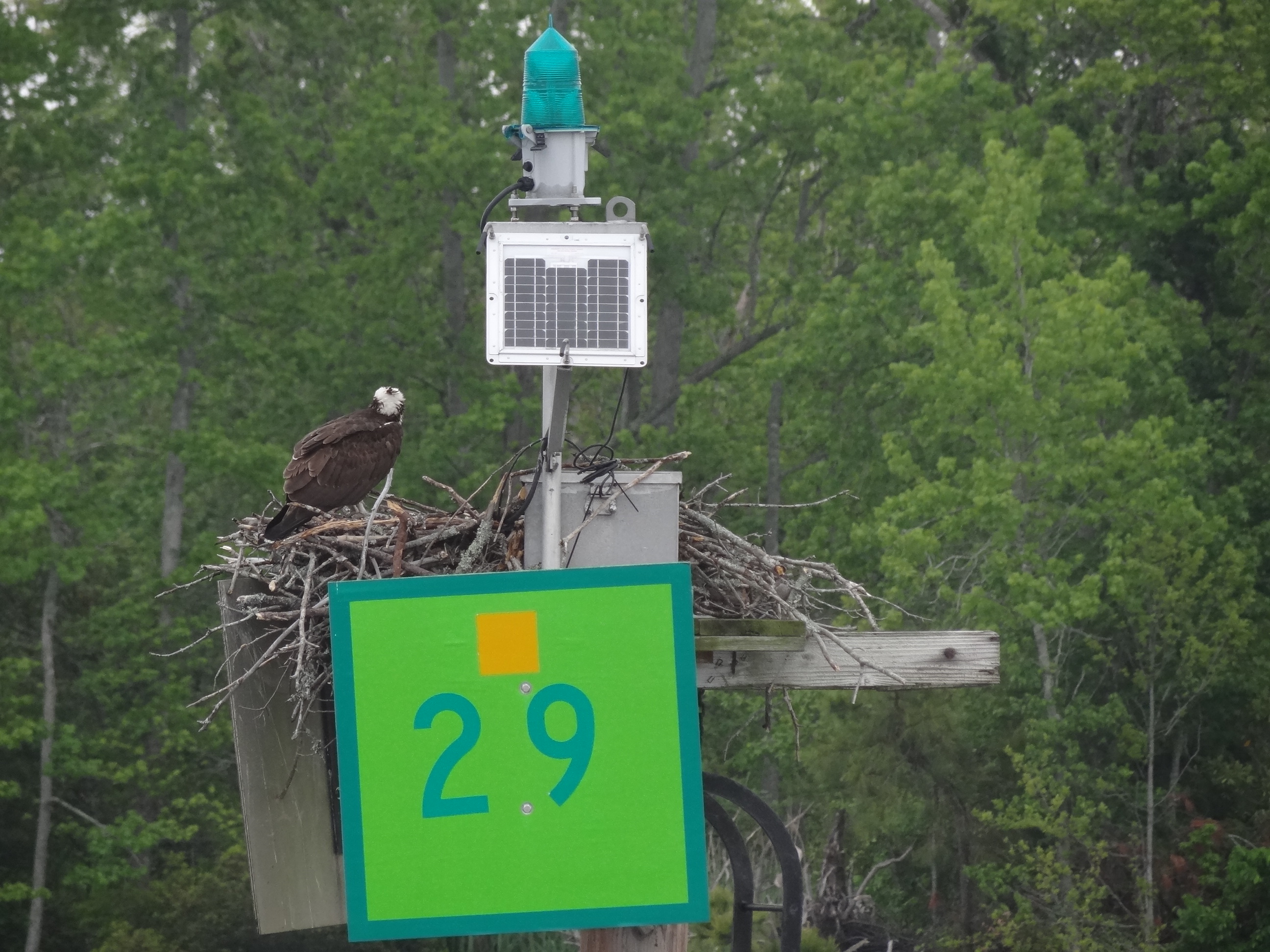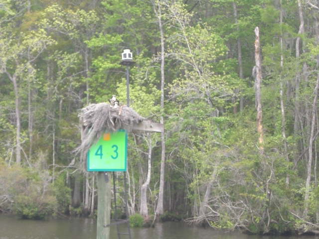 Along the many miles of AICW some stretches are rather boring while others offer an ever-changing look at the beauty and wonder of nature. We prefer the latter, especially when shoaling is not a concern or bridges don’t force us to think about them. The Waccamaw River stretch between Georgetown, SC until a few miles south of Myrtle Beach is one stretch we enjoy. In spring the osprey have been busy with their nests and they line the banks of the river one right after the other; usually in dead trees at the waters’ edge but robust day markers make a great nest location too.