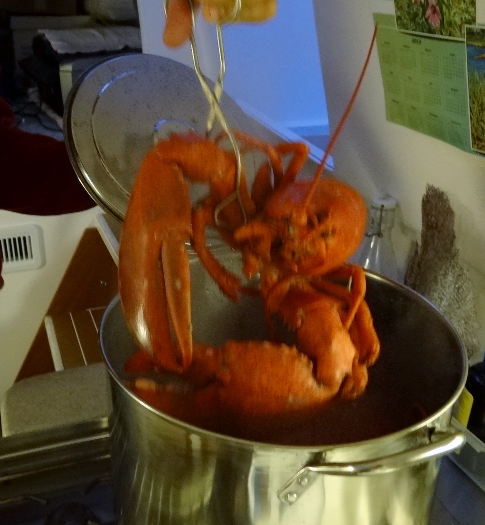 Lobster baby, cold water New England ones- the largest one we’ve ever steamed cuz Shop Rite had them for $4.99/lb. This dude provided dinner and two breakfasts of lobster omelets. Four pounds, steamed 18 minutes after re-boil- perfect. Many say larger lobsters are tougher, but that is often caused by over-cooking. We dip ours in a mix of melted salted and un-salted butter and squirt of lemon juice. Crackers were no match for this guy; we needed a hammer!