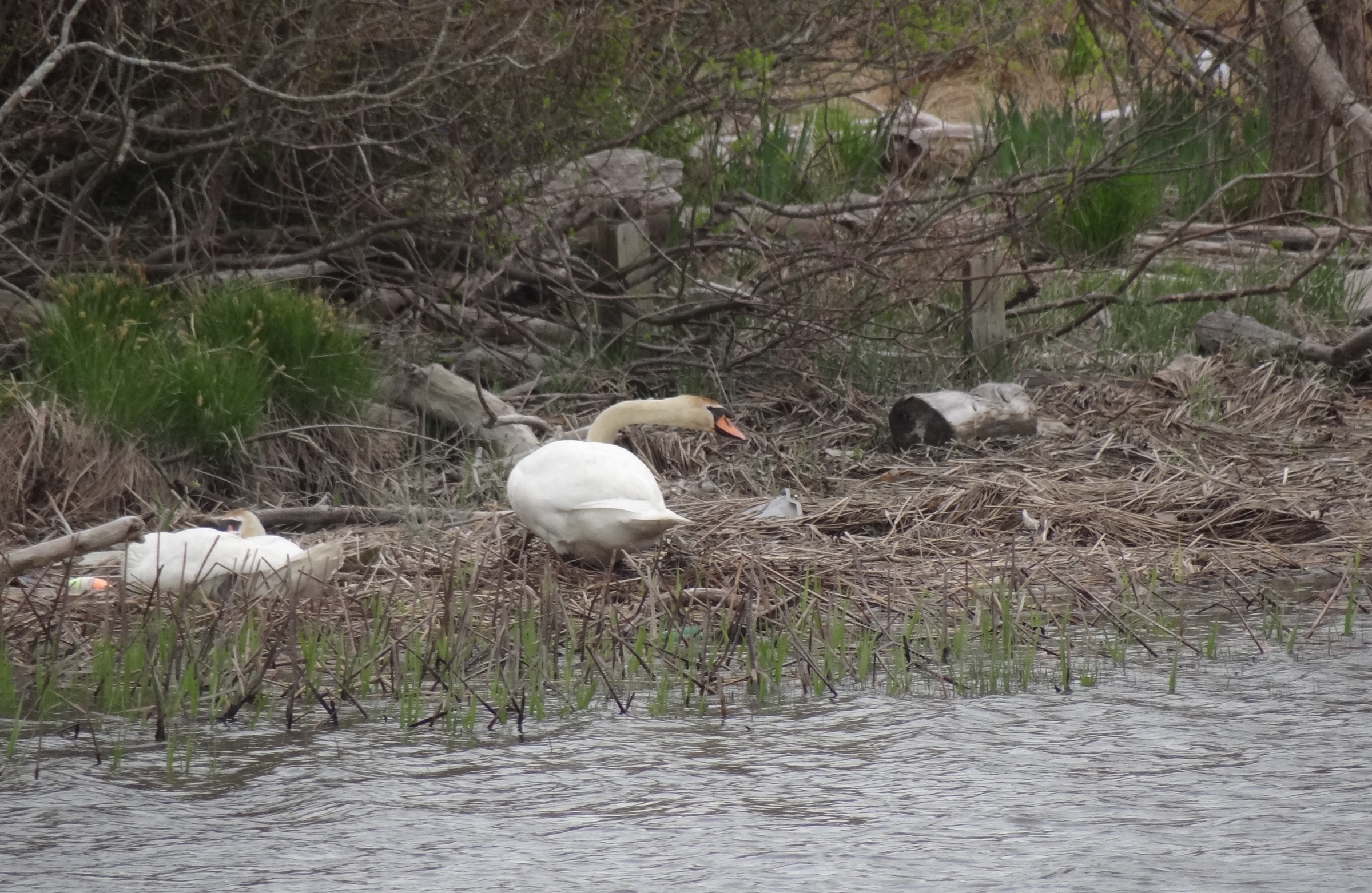 I was very happy to see a pair of mute swans take up nest-building on the banks practically opposite the boat. How great to see first-hand how the nest is made and then the whole process following. The cygnets would be the cutest- not ugly- creatures to watch. We’ve read that both male and female participate in nest-building.
