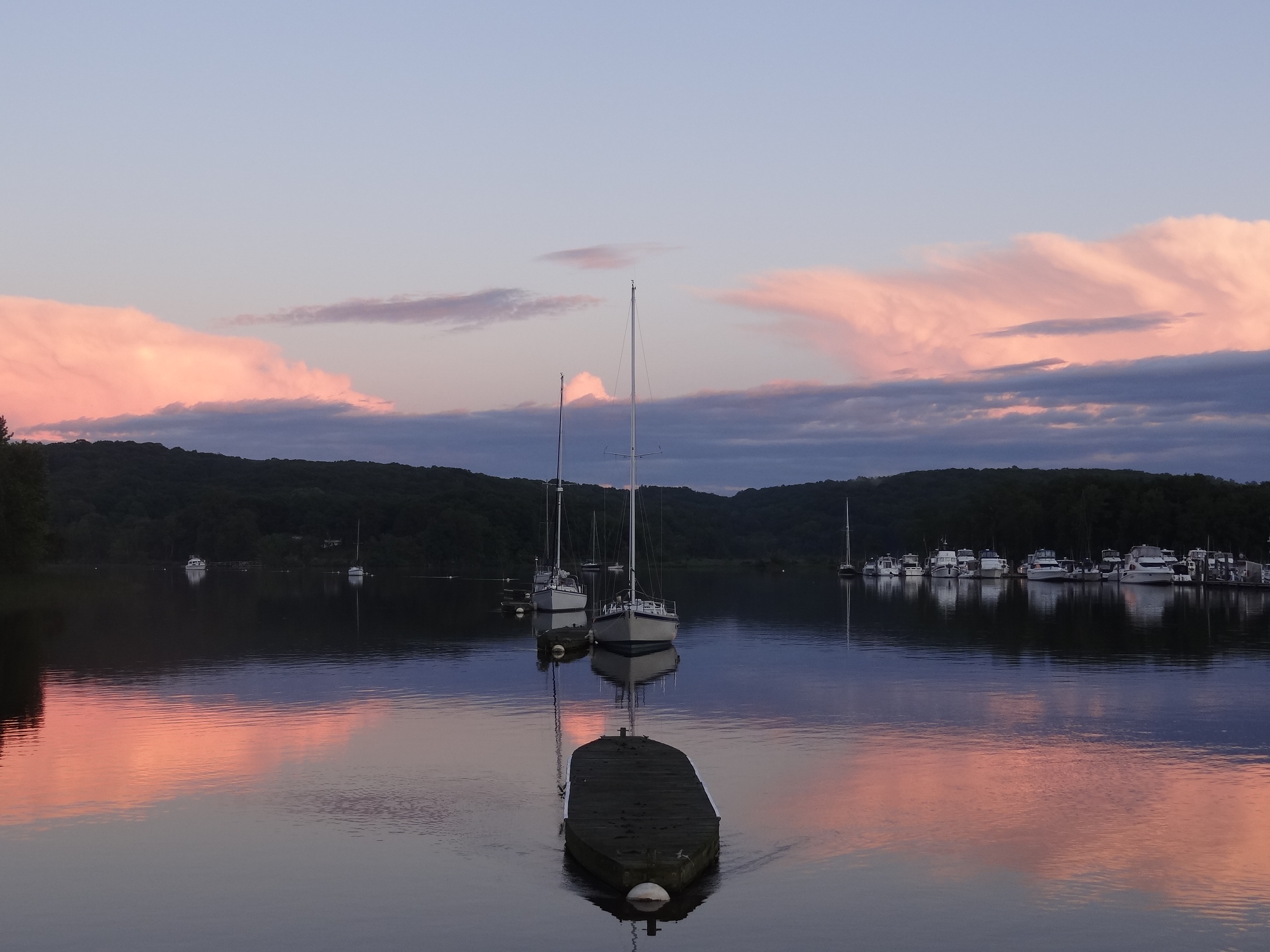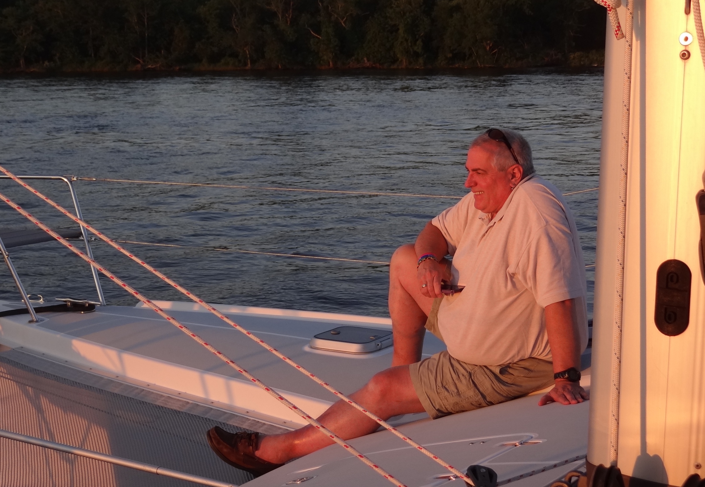 The weekend before last started out pleasantly enough with warm, sunny weather and a much anticipated visit from Martin and Laurie Bradburn, Lily’s parents. They arrived Saturday afternoon for a taste of catamaran life. We made sure to give them the (almost) full treatment, complete with a dinghy ride from the dock to the mooring. In lieu of sailing we simply sped down river, aided by a 3kt current, complements of recent rainfall. Hamburg Cove was passed by in favor of a swing past the Essex Yacht Clubs and CT River Museum, ending up anchored off Nott Island with a view of Essex harbor. Muscle memory proved itself alive as we executed all operations without a hitch. I always worry about my role at the bow when we anchor. Russ tried to tell me that anchor raising was my job too, but I knew better and shoved him outside to deal with that and push a few branches out of the way too. An entire forest has come down river over the past couple of weeks.