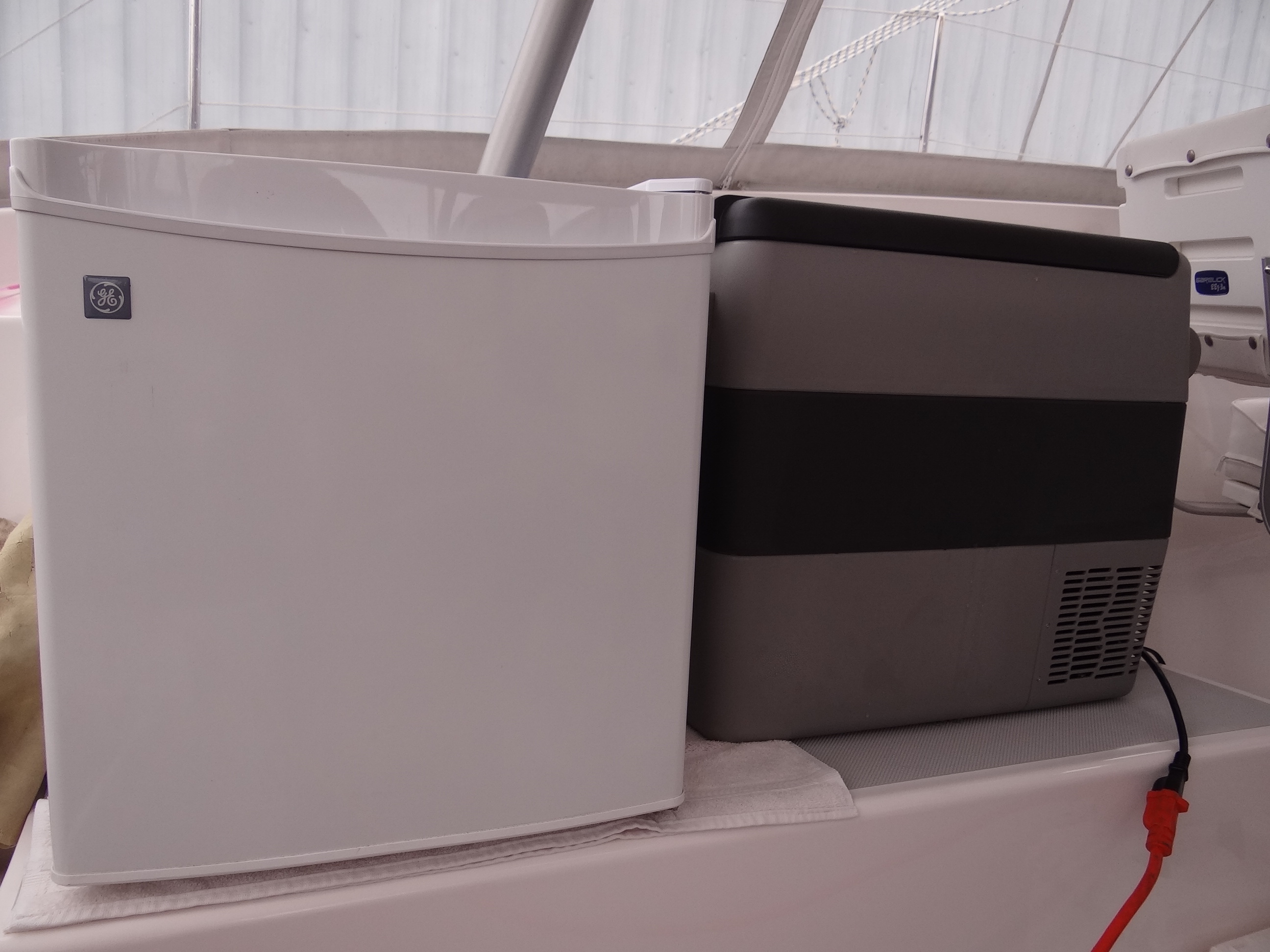 This being our third haul-out we were determined to be well-prepared-even more than last year. Being July, Russ was wise enough to insist on buying a used portable AC unit. In my infinite wisdom, I’d pined for a fridge/freezer cooler and we’d ended up with an isotherm unit, not quite the equal of an Engel. This was a very au courant unit in that, well you see, it goes both ways. Since we like duality on board Ortolan, this would be a perfect addition and a companion for our “cube” fridge during haul-outs.
