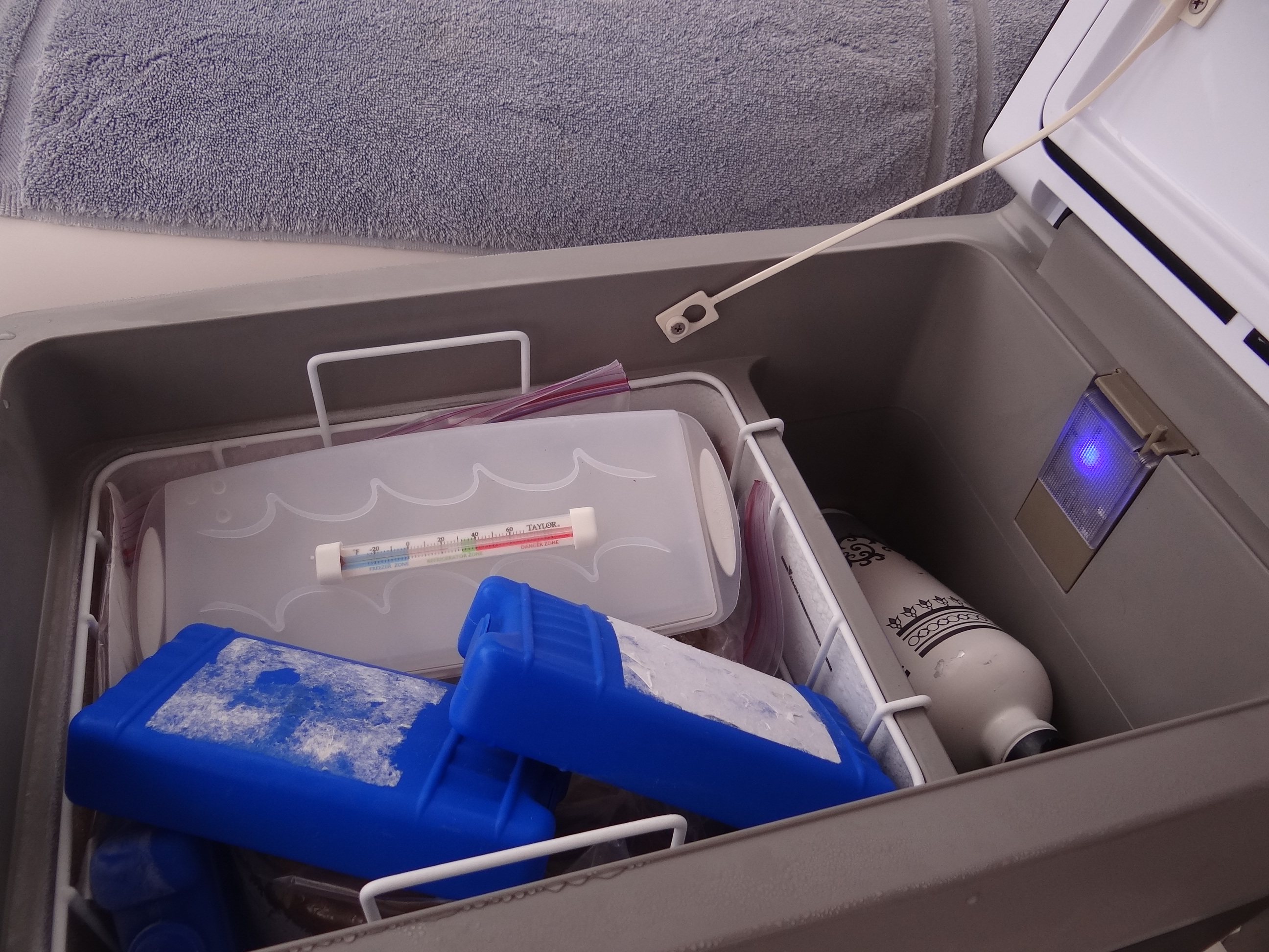 As you may recall, our Frigoboat freezer and refrigerator do not work out of water, so what is one to do? Year 1: borrowed a dorm fridge from Lily and used the freezer compartment as an ice box for the overflow. Year 2: had the small cube and the ice box. Year 3: cube for a fridge, isotherm (we call it the Engel :-)) as a freezer AND the icebox (because the cube isn’t very big). The icebox is just that, a block of ice and two ice packs struggle to keep the contents cold. Unfortunately on Day 6 when Russ went to get a new block of ice, all gone. He’d commented that last time only a few were in stock; maybe not enough demand?- hey we need them! So a bag of cubes would have to suffice.