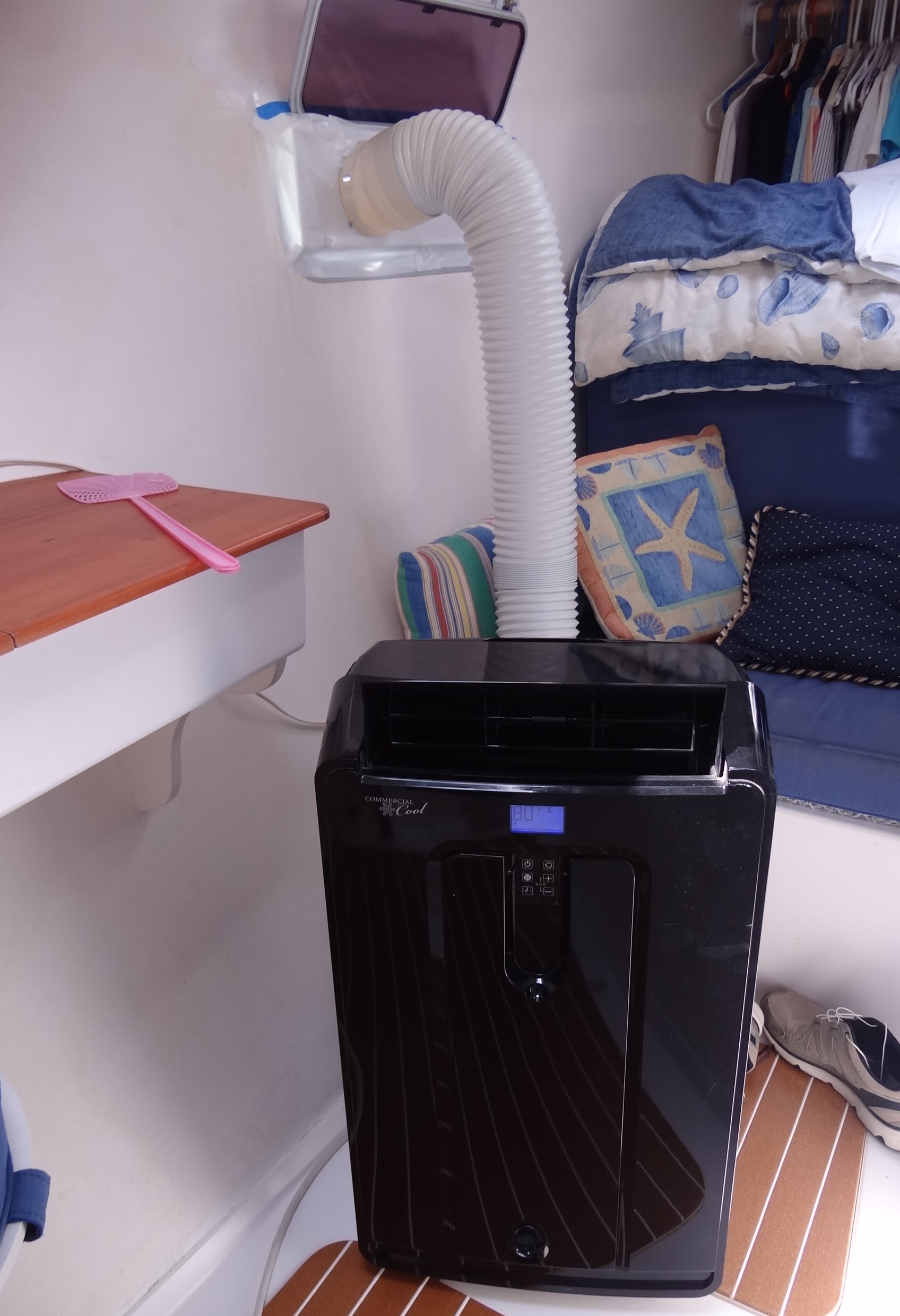We installed the portable AC unit in the starboard side, nav station area in the hopes it would keep that hull cool. Of course as the heat climbed to 90 plus, even at 10,000 BTUs it could not keep up so we closed the curtain by our bunk so that it could more easily cool just the very forward part during the day. In the evening we opened the curtain. For several nights we have needed to run this at night. Hot, damn hot. July, what else? You can see the display indicates 80 degrees; that is after running all night and day, curtain closed and an outside temp of 92.