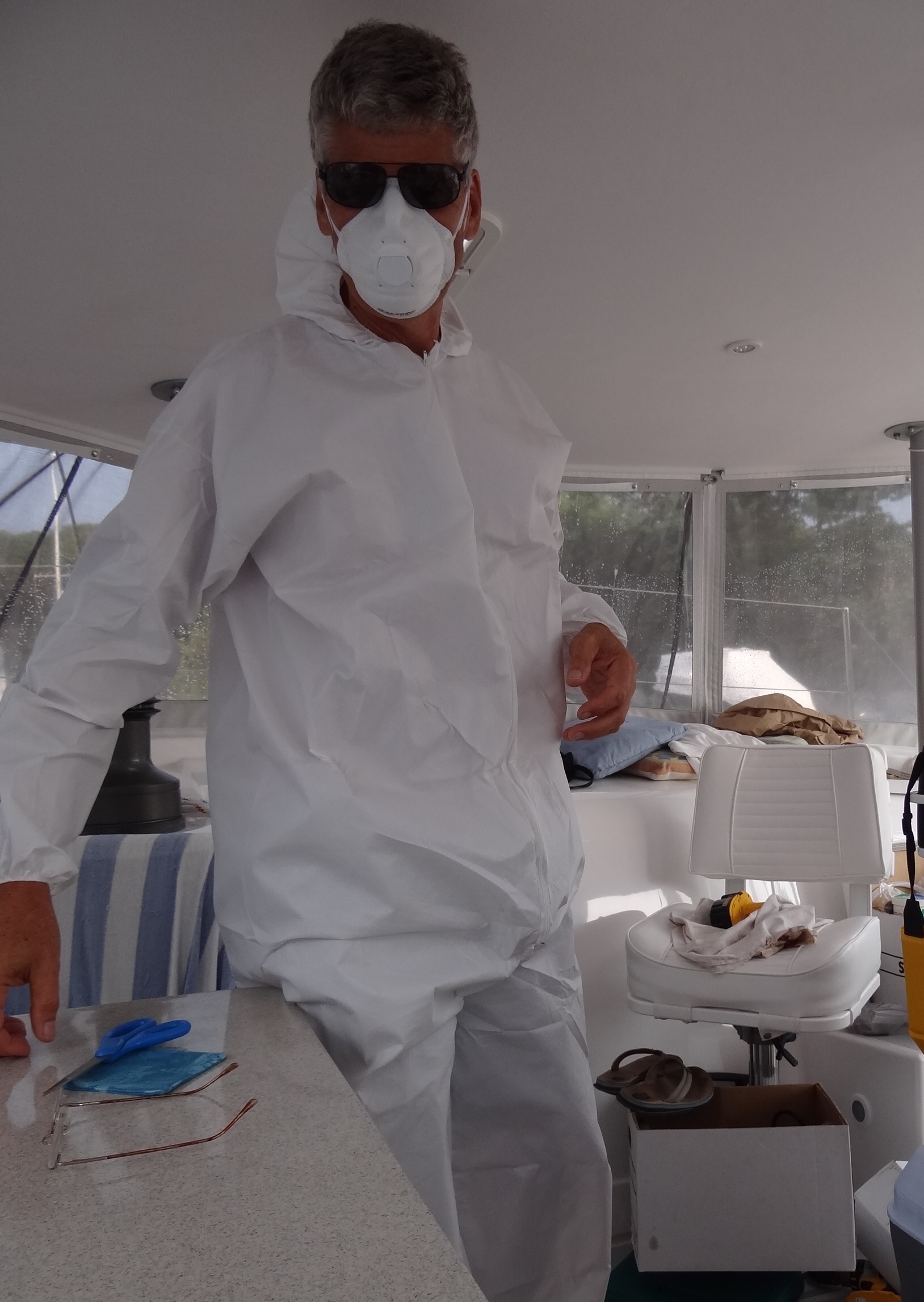 Day 20: Yippee for Thunderstorms. Bring ‘em on; let’s get this HHH pushed out and back to more humane temps. (a high of 96 at 2pm dropped like a rock to 79 at 5:30pm) Before the lightning show at 4pm, we enjoyed a delightful mid-morning brunch at Lori and Martin’s. We bid farewell to Benj and Lily who would head back to VT today; she to Middlebury and he to Home Sweet Yurt. Wait, is that a sander I see? sandpaper and a white suit? Noooooooo, the dreaded bottom sanding, which precedes the most fun of all, bottom painting. With a hopeful back-in-the-water day of Wed, he who works too hard, is entering the final work phase. He’s so lucky to have my to photograph his accomplishments (and manly outfits).