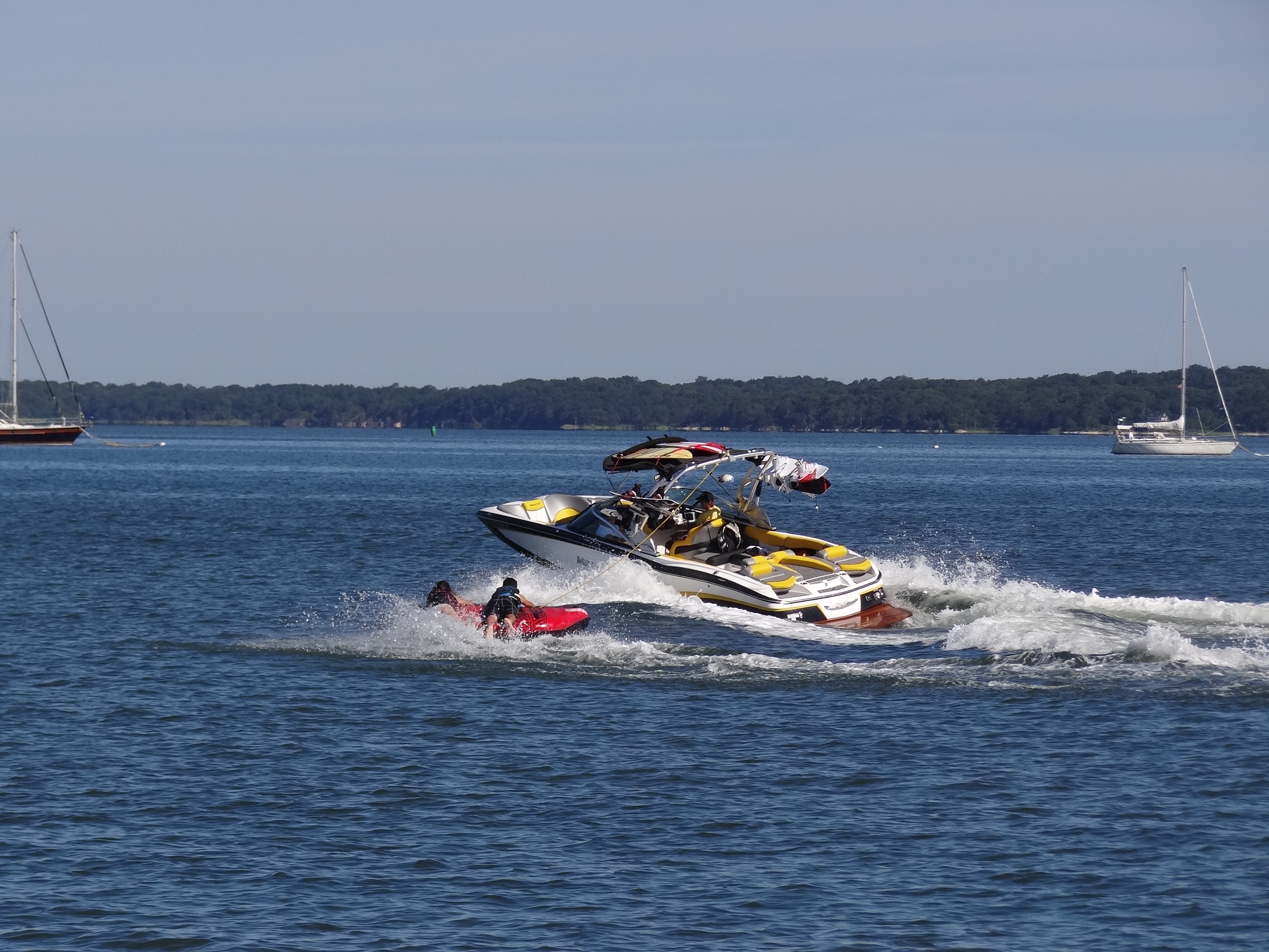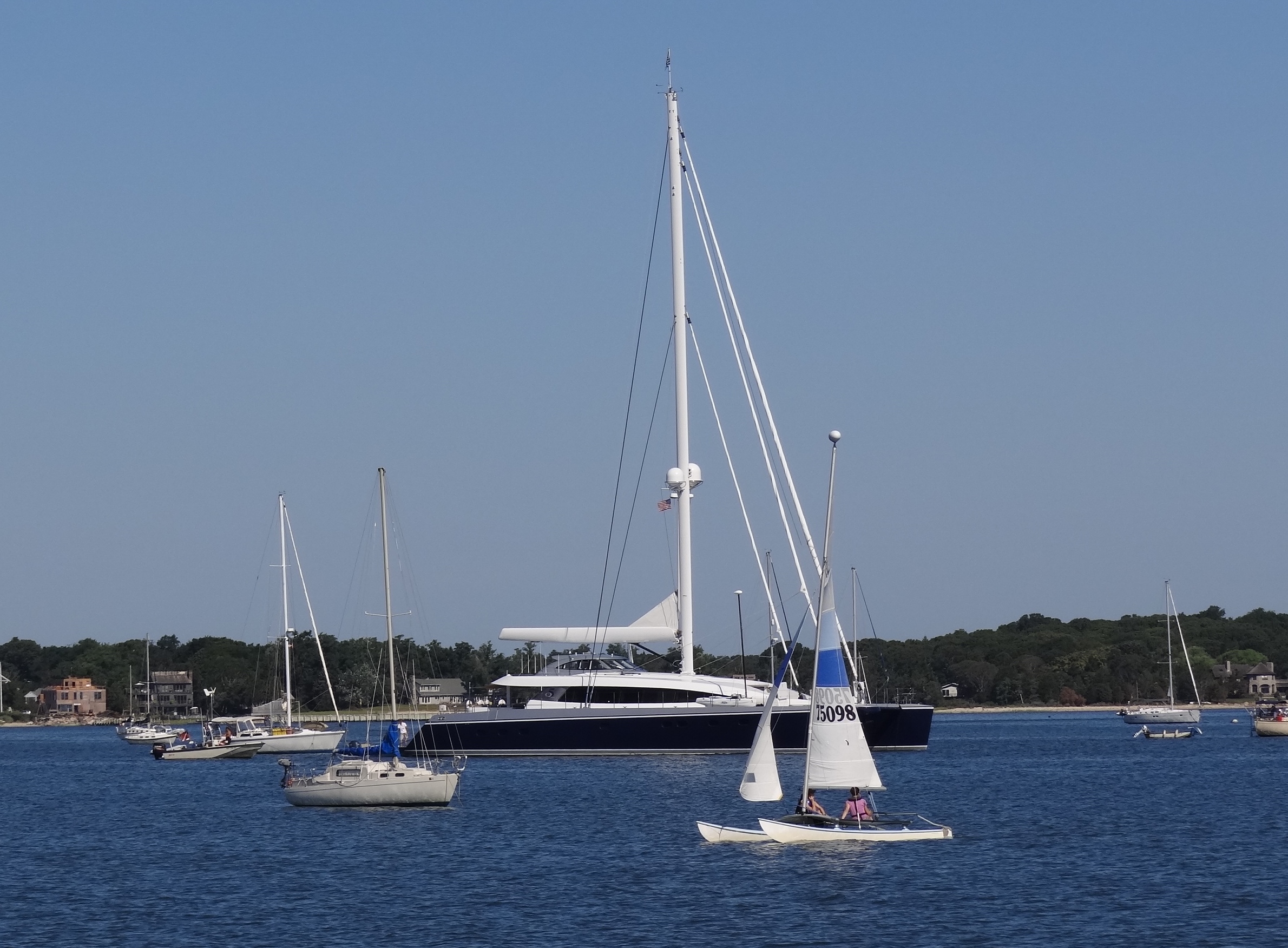 Monday, August 5 and what fun cruising destinations have we entered in our log? Ah, none. OK maybe one if you count stopping at Dutch Harbor and Jamestown on our way to Barrington, RI. Determined to salvage our remaining time before heading south, perhaps in September this year, Russ said, “we’re going somewhere for a few days.” Block? No, too far. Greenport/Shelter Island? Almost won out but the mooring fee in Derring Harbor was $60, so that left Sag Harbor; not too hard to take. We could anchor outside the breakwater in good holding sand; the weather promised perfection for our visit. But could those big white hankies be of any use? Wind at our stern; check. True wind speed 10-15; check. Waves 1-2 ft; check. No problem with that, right? None, except that the wind was exactly smack dead behind us so motor-sailing with the boom complaining was the mode until we’d passed thru Plum Gut into Gardiner’s Bay. There, after avoiding the Orient Point ferries, our course across the Bay toward Sag would allow those Yanmars to go silent. The apparent wind was ideal, the Bay mere wavelets and for a while we had all three sails in action screaming along at 8kts.