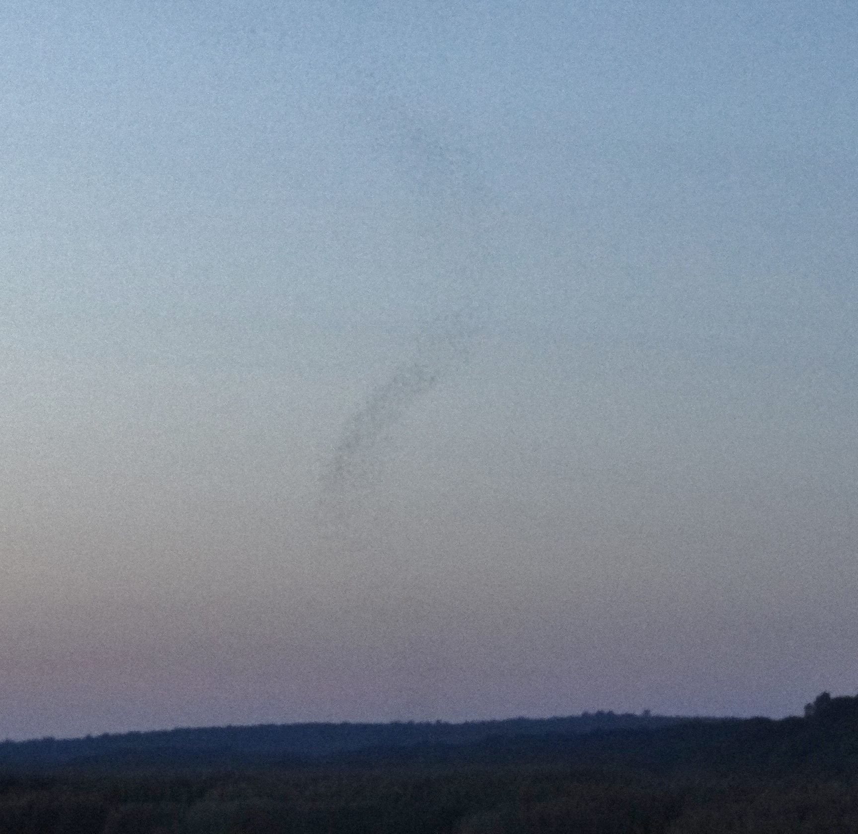 Starting some time near the end of August, during the entire month of September and into October, thousands of birds congregate in the lower Connecticut River Valley on their migration route south. One massing in particular is an attention-getter. Each day at dusk in late summer and early fall, hundreds of thousands of swallows fly in from all directions and gather over a small island in the Connecticut River. There, for perhaps no more than 20 minutes, they mill around in an enormous, undulating mass of life, specks of black in the fading late-day light. (you can read this as: difficult to snap a clear photo in fading light)