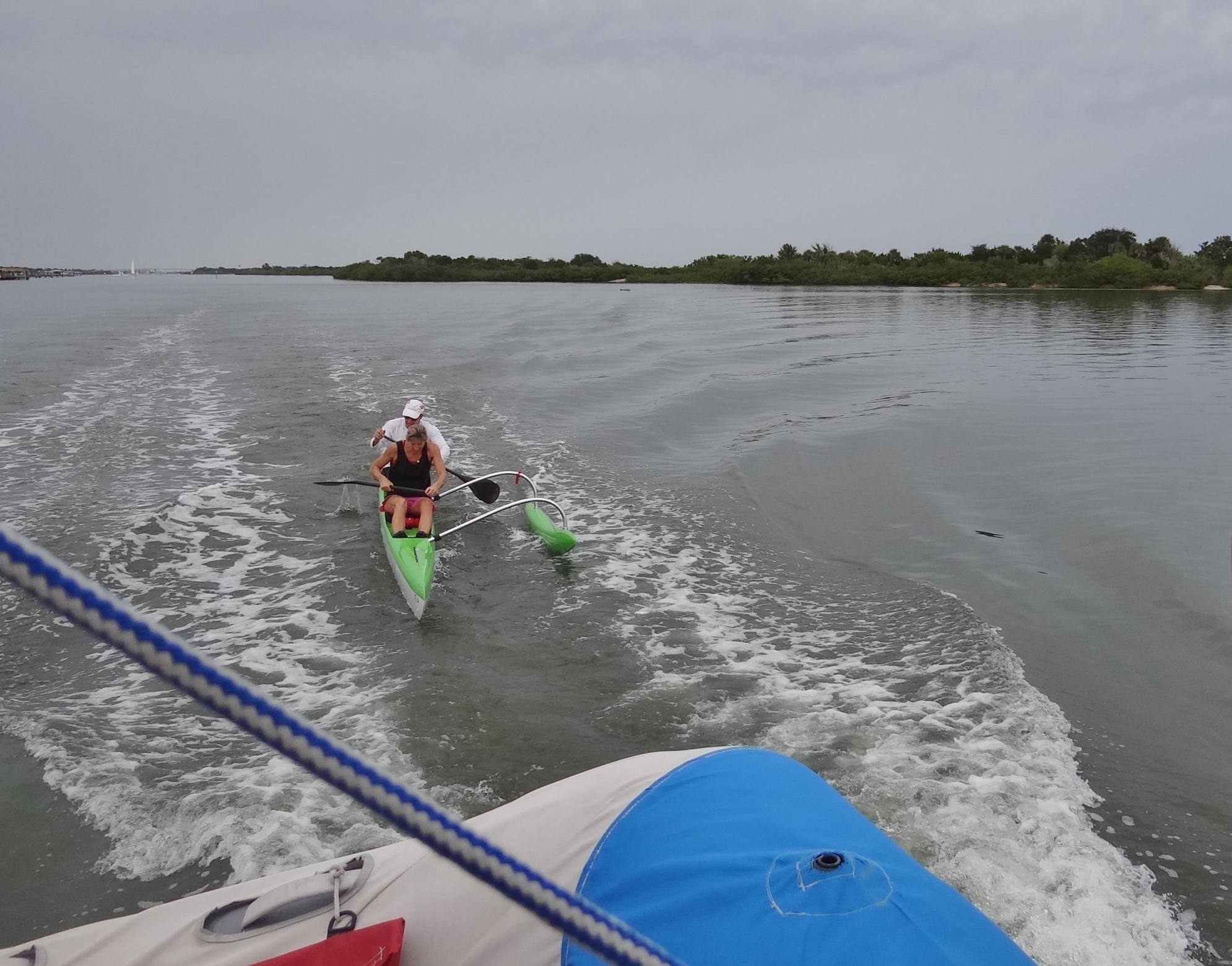 An area we travel through twice a year is the Upper Indian River/Mosquito Lagoon stretch. Dotted with mangrove islands, Fishing and RV Camps on the west shore, the lagoon is a haven for manatees, egrets, herons, dolphins, osprey and more. Weekends explode with small boats; pontoons, fishing skiffs, kayaks and today, Friday, the speed demon of them all: an outrigger canoe. The day was overcast which was a bummer because the area is so lovely with sunshine.