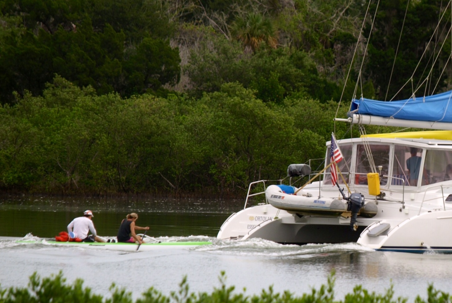We pass s/v Snow Goose who gets a kick out of our tiny parade while a short time later I warn our wake paddlers that we’ll be slowing down to allow a motor yacht to pass; a “slow pass” we cruisers call it. The camera goes into Movie mode- I mean after 15 minutes this needs more than a photo or two.