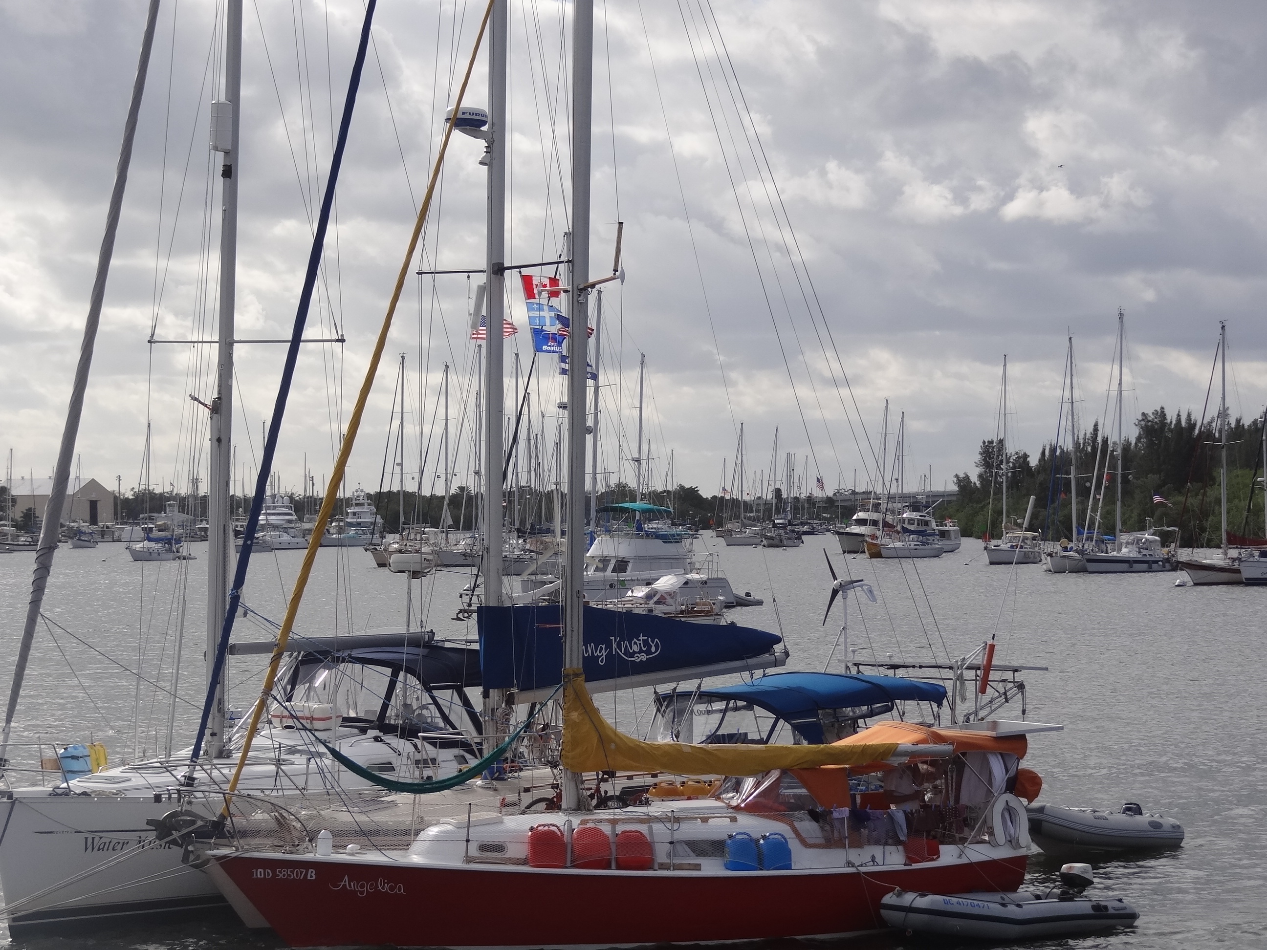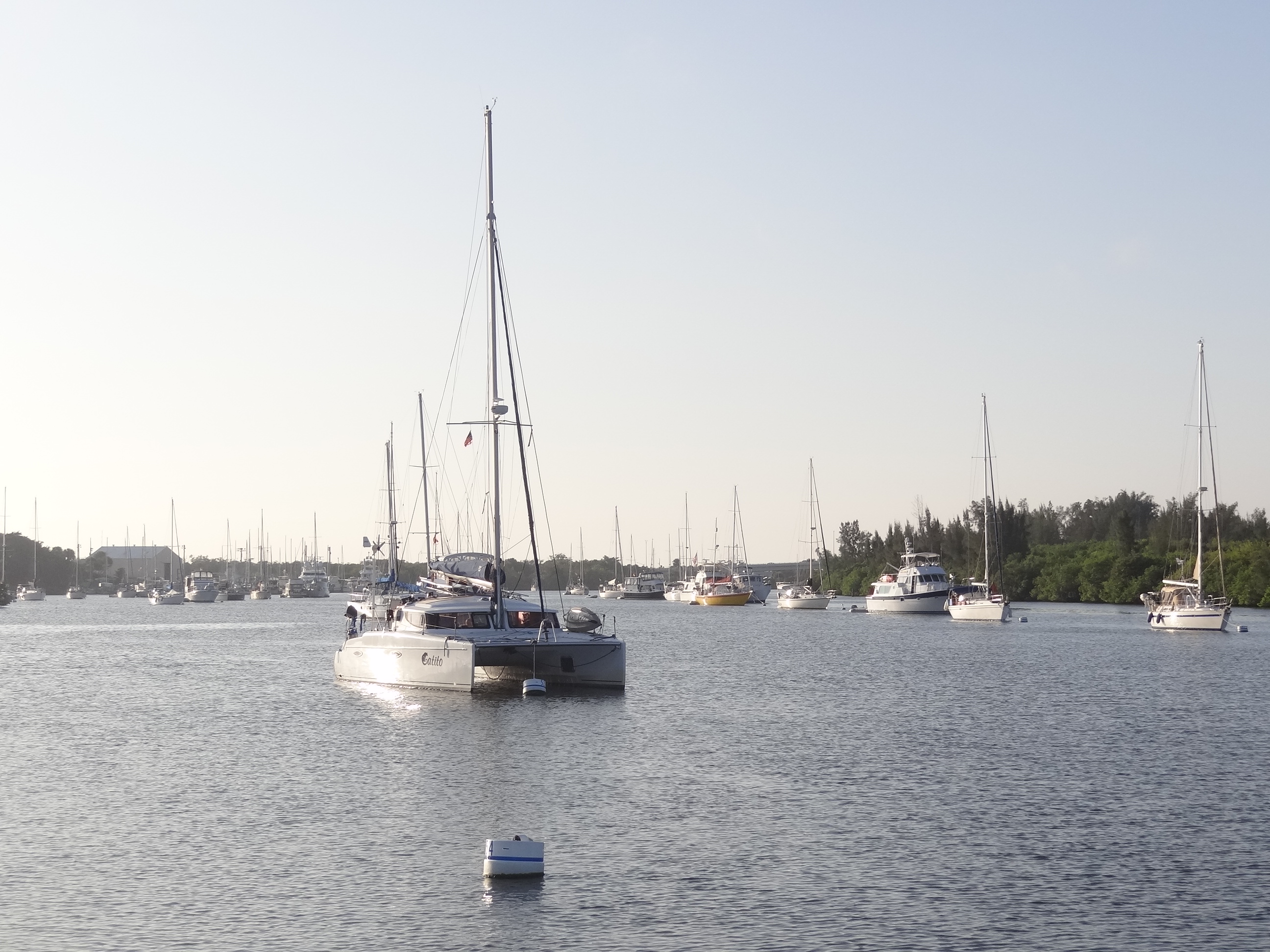 Boats poured in – some even left- until nearly every ball had two or three boats rafted together. A few days before Thanksgiving SeaSparrow arrived and since we were the sole occupant of M56 and only one other cat was available to raft up with, we listened to what the marina would have them do. Except the marina didn’t respond to their radio calls. Debbie and Jeff are newbie sailors and boat owners who we’d met in Marineland. Russ went out to offer assistance and soon returned leading SeaSparrow to M52, two balls south of us. Nice. Since we are up in the nosebleed section, #56 out of 57, was good to have them close.