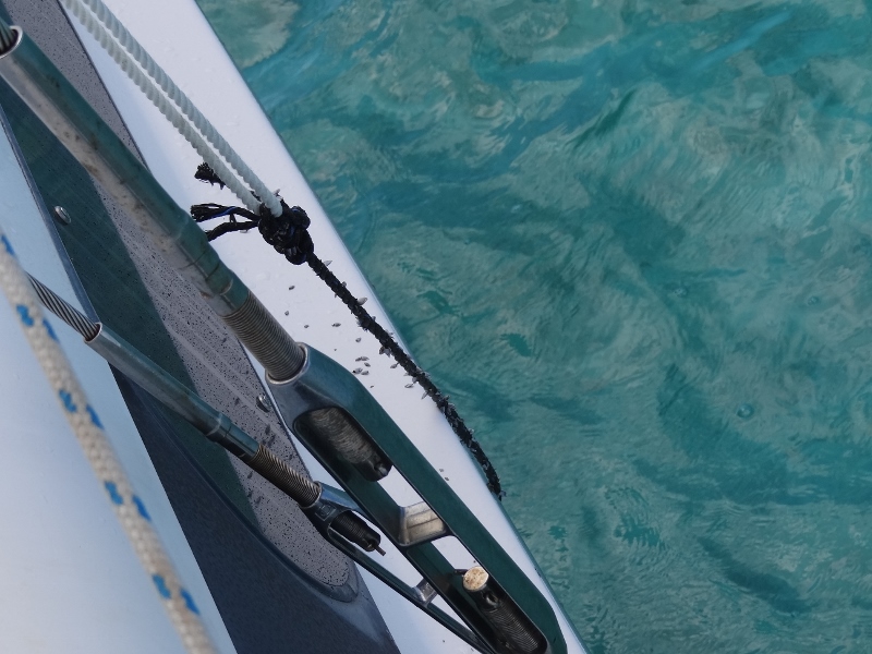 So we worked on that for 30 mins and then Russ noticed a 3/8” black line floating in the water about mid-ship under the starboard hull; we could see just a foot or so of it floating next to the boat. Humm. Here’s my version: Russ thought the line might be attached to something, maybe an old mooring or something heavy sitting 8ft down with a line on it. When we made our approach to anchor I was watching at the bow to be sure we dropped anchor in a sandy spot and I did not see anything in the water. Of course, I could not be 100% sure- but 95% anyway.  I suggested we use the boat hook to try and pick it up and see what happens. That idea was rejected. A short time after we spotted the line, a slight wind shift moved us and what do you know but the line was still under the starboard hull in the same spot. So now I am adamant that this line is not in the sand but somehow attached to our hull, like a remora.  More of the line seemed visible so I retrieved the boat hook and was able to lift up enough of the line so Russ could grab it. At that moment I realized, and Russ did too, that the line must have gotten wedged into the dagger board trunk on our trip from Cat.