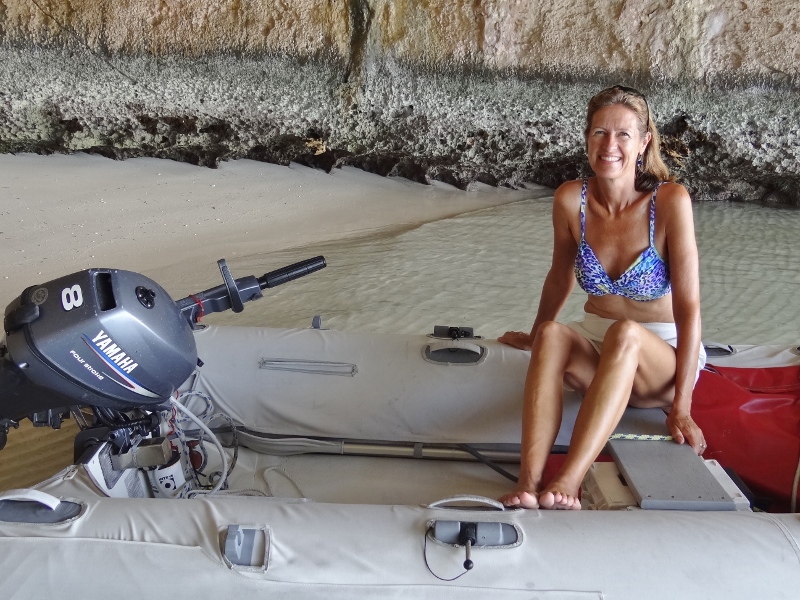 Around the corner from where we’d anchored was this very cool cave that you could walk or dinghy into at low tide; and that darn dog couldn’t chase you away! Complete with a teeny beach, the requisite skylights and interesting cracks and crevices, we also spied a juvenile conch making tracks for someplace to call home.