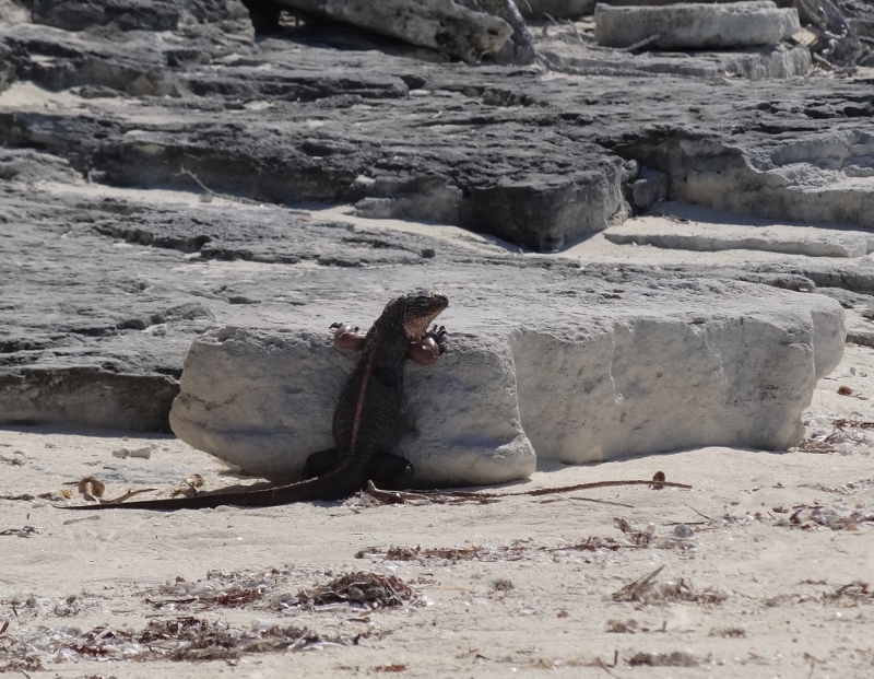 Bitter Guana Cay and her neighbor, South Gaulin Cay are home to the endangered Rock Iguanas. They greet everyone who lands on the beach, hoping for a tasty fruit or veggie morsel, even though people are requested not to feed them.