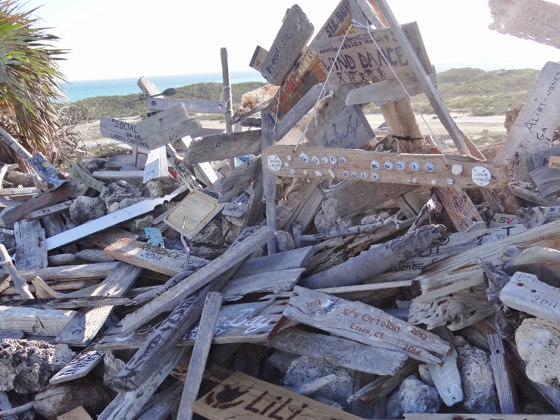 Hiked a few new trails, Russ snorkeled and we took our new and improved driftwood boat plaque up to Boo Boo Hill. Ours is near the bottom. This photo shows only about half of the extensive, impressive pile.