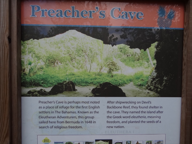 The tidy, colorful community dates back to the 17th century when the Eleutheran Adventurers left England looking for religious freedom. They didn’t find what they wanted in Bermuda and many ended up washed up on Eleuthera’s north shore, known as the Devil’s Backbone.(the reef area under the words See Chart EL 6 on the chart photo) An angel watched over them and they found a huge cave that is now called Preacher’s Cave. The cave provided shelter and enabled them to survive; talk about roughing it.