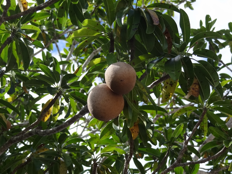 A sapodilly tree and the round, edible fruit. Apricot colored, tasted like a guava/kiwi blend. We took two home to ripen