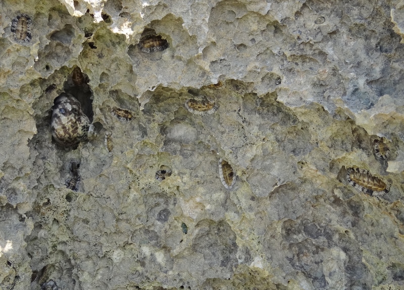The things in the rocks are chitons (like Kite), aka “coat-of-mail” shells. They have 8 separate shellplates that overlap and articulate so they can move and curl up if need be. Have never seen any of them move- just well attached to the rocks. On Guana Cay we found one on the beach and I am soaking it to try and remove the smell.