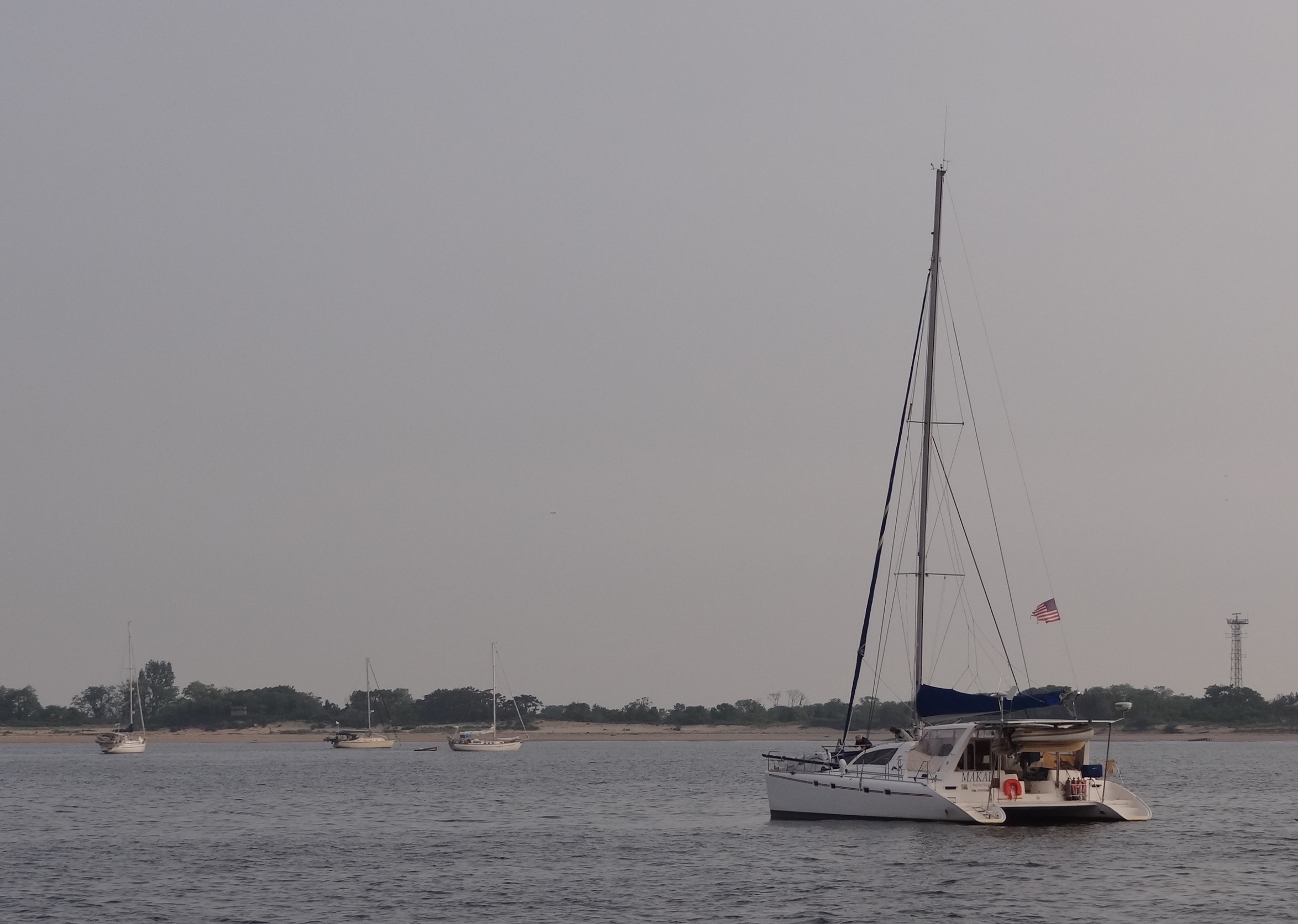 Who needs a report or delayed radar when you can see exactly what’s happening up ahead? By some miracle (me having used up every prayer and promise in my favor bank) the worst of what was nearby, passed just north of Sandy Hook. The wind kicked up to 24kts for a spell, shifted 180 degrees, the sky darkened but, sorry for the cliche, light shown at the end of the tunnel. By 6pm we’d dropped the hook next to s/v Makai who was anchored near the Coast Guard Station along with four others.