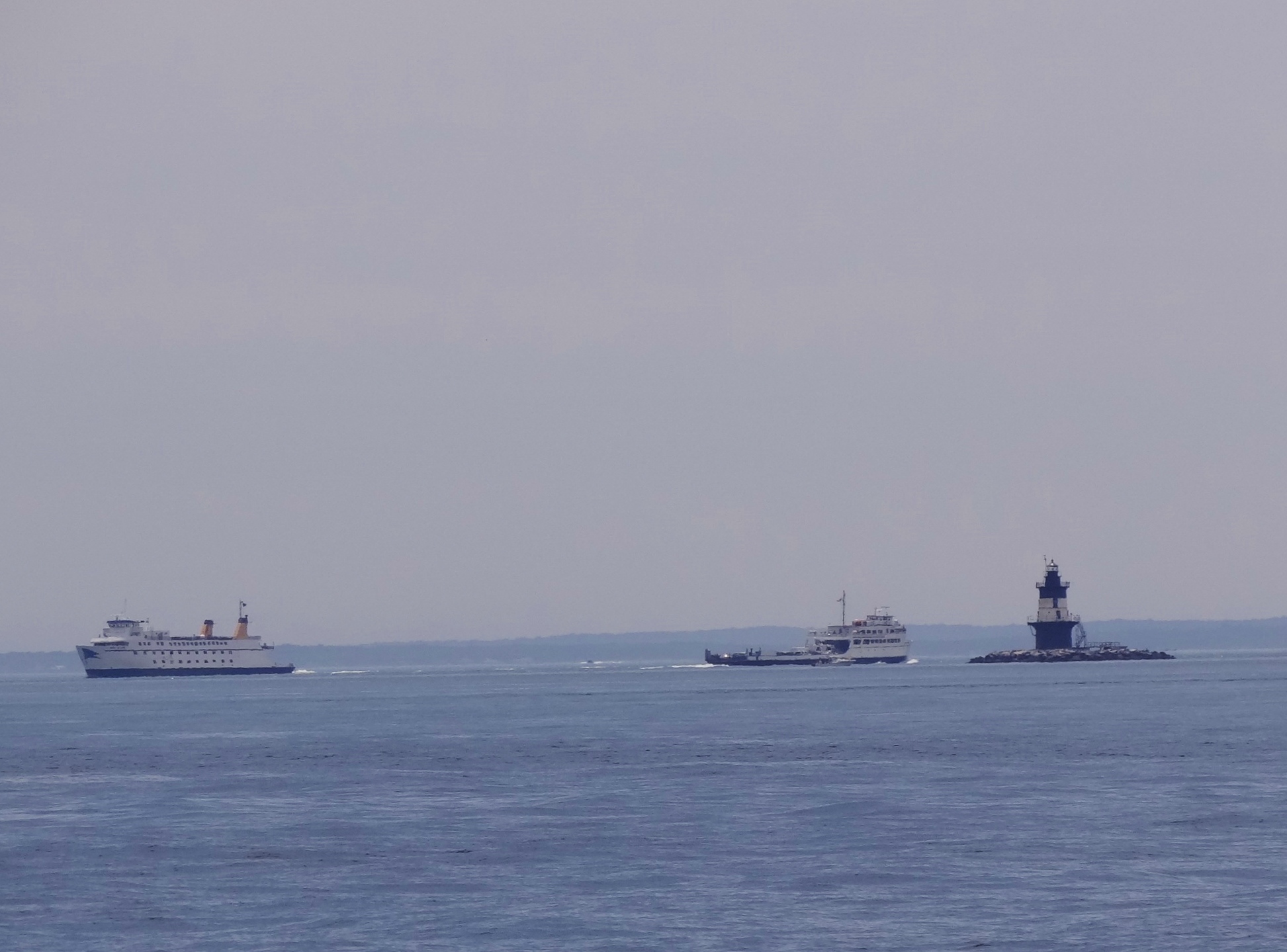Plum Gut, that notoriously rough passage between LIS and Gardiner’s Bay welcomed us with barely a wavelet and the ferries that run between New London, CT and Orient Point, NY passed before we arrived.