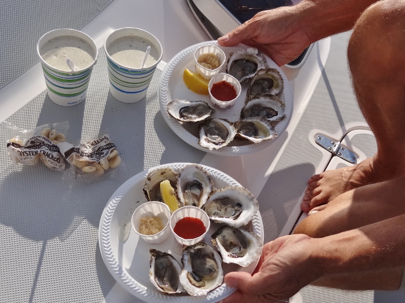 Cuttyhunk oysters are a must even at a price I will not tell you. Freshly harvested right here and delivered by the Raw Bar boat, along with chowder and clams on the 1/2 shell. You need to get Stuffies at the store on the dock.