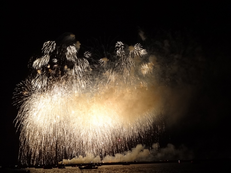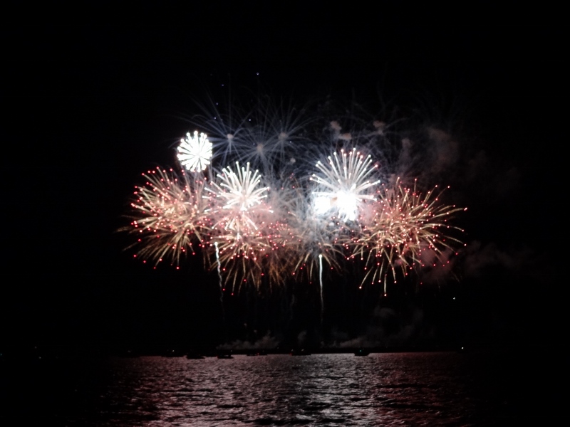 Today was another cool-ish day (haven’t seen 80F in the past week) but by show time at 9pm the wind was way down and we sat in our chairs at the stern for the show. Lots of local boats came out but not a remarkable amount and we made sure to be well-lit up at departure time.