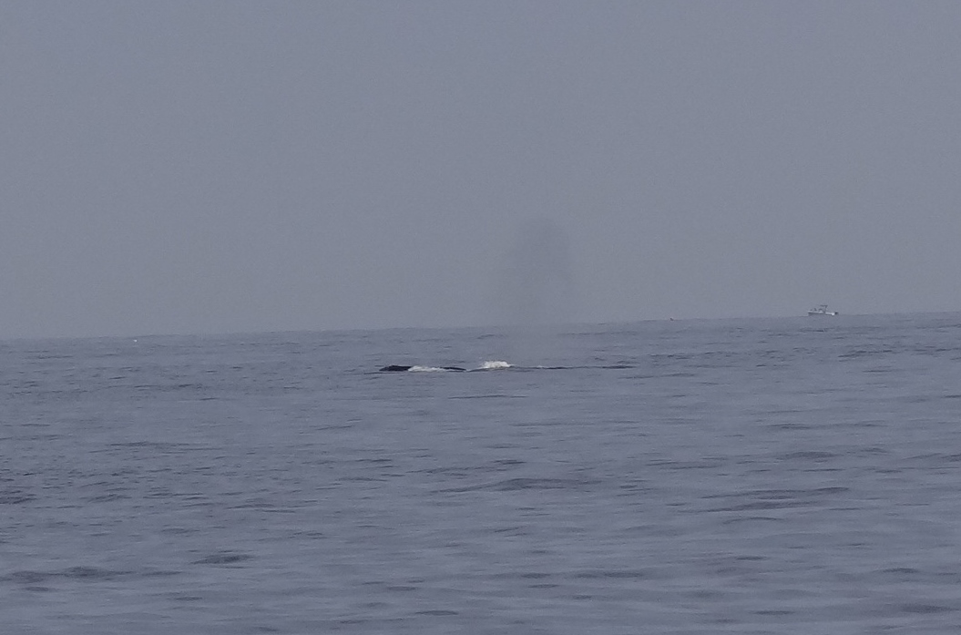 Off the coast of New Hampshire -which isn’t much coastline at all, about five miles south of Isles of Shoals we saw a boat. Zooming. Ferry? No, a whale watching boat and then it stopped about one mile from us. For an hour we hung out watching, and listening to whale songs.