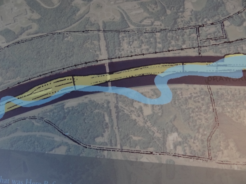 A huge display showed the river (blue) that eventually became today’s canal (dark). The yellow shows the first attempt.