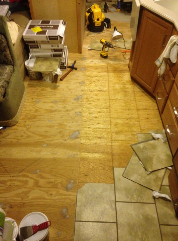 Much of this fall-ness occurred while we watched from our front window, heads bent and bodies contorted in dogged pursuit of a new tile floor. This new flooring (Armstrong Luxury Vinyl) would cover the entire floor except for the bedroom. I’ll skip the long story of tile acquisition except to say that in the end we bagged a great deal on-line from Abby Carpet in Weymouth, MA.