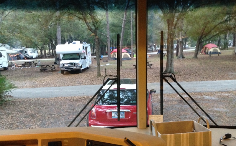 I’d been bragging that our site was a pull-through, always easier than backing in because even if you are a super-pro the car has to be unhooked before you back in and you need room to do that. Often you do that in the parking lot at check-in. Since our spot was a pull-through we didn’t unhook and Bonny got a campground tour too. We pull into the site, brushing just a few palm fronds, our 52ft total length fits fine, but what’s this the electric and water hookups are at the end of the site not in the usual middle. You can guess what that means; yep we have to unhook, move Bonny and THEN we can back up the necessary 12ft.