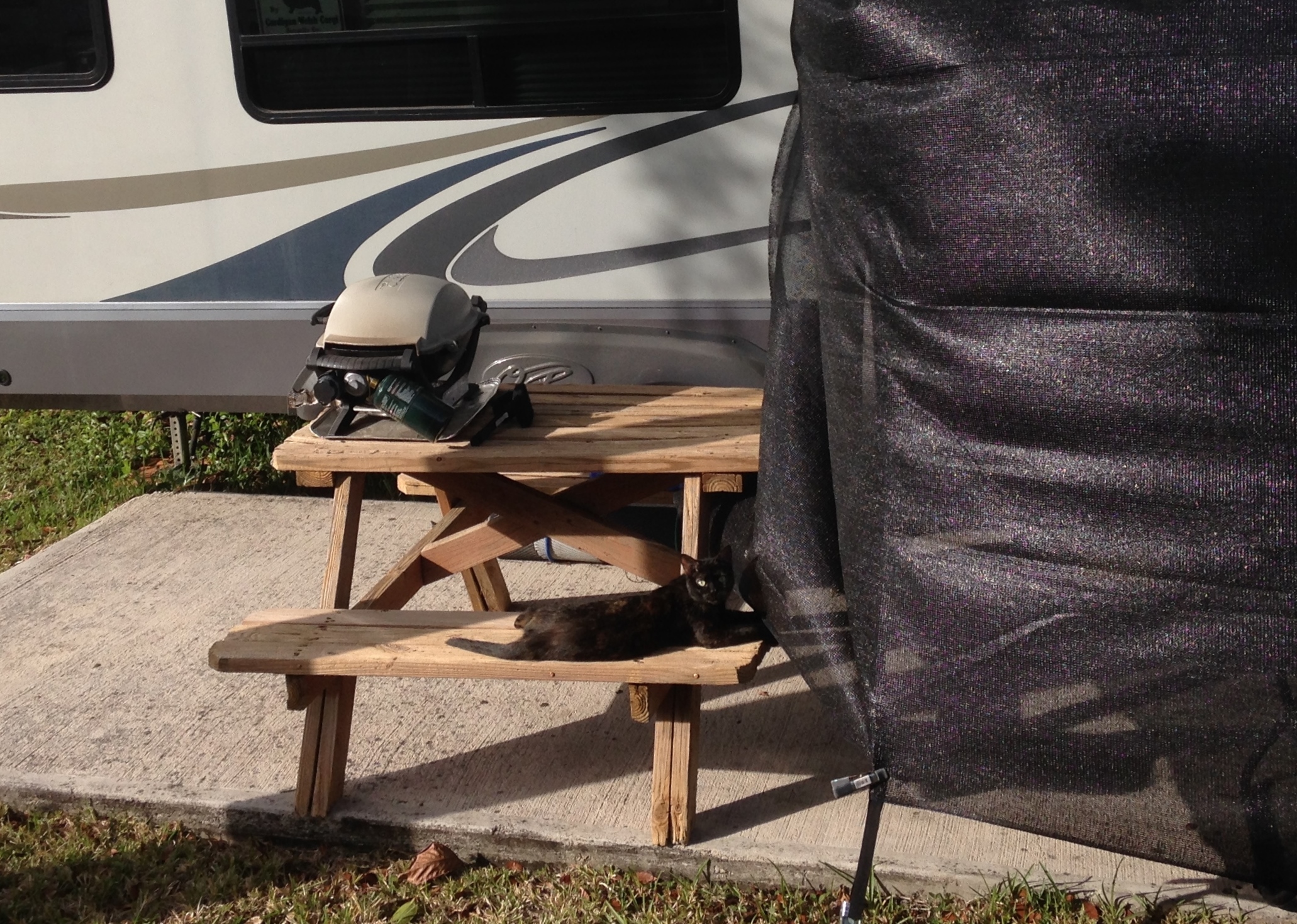 We’ve seen RVs come and go but the majority are here for the 3 or 4 winter months. Not overly friendly nor unfriendly, many with dogs, many smokers and a 60/40 mix of Class A motorhomes and 5th wheels/travel trailers with a few tents and tiny campers tossed in. We spent a few days being amazed by the tiny camper that arrived the day after us. I was taking a rare sun basking when they pulled up, looked around and I figured that a pickup truck was parked where they needed to be. You are supposed to keep your and your visitor’s vehicles on your site, but many sites are vacant so they become overflow parking. The man approached me wondering if I knew who owned the truck but I could only suggest he check at the office. Sounded French Canadian.