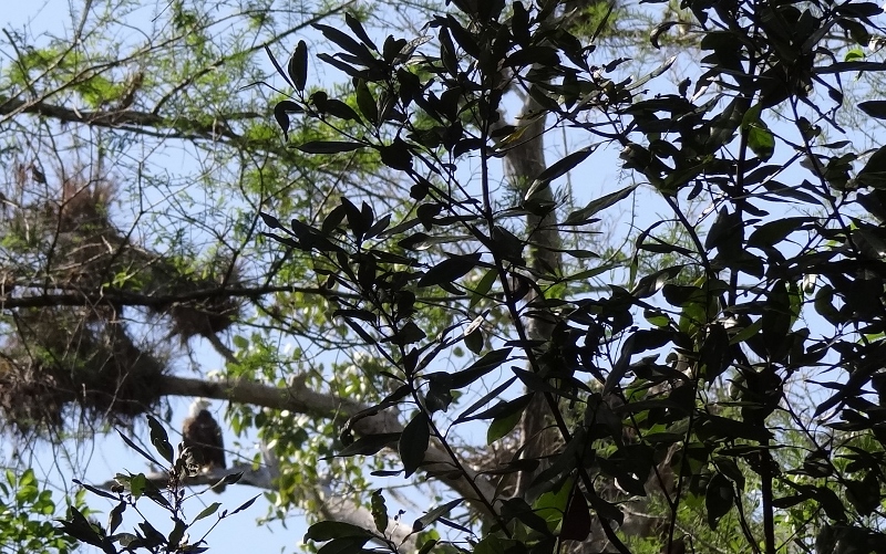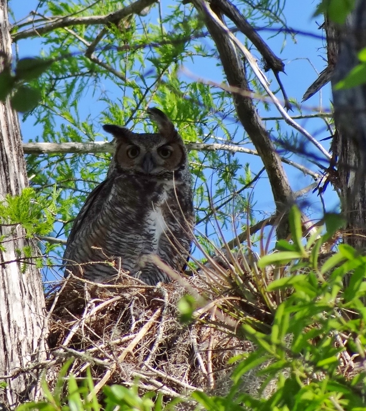 The Big Cypress Bend (I keep typing j instead of the d in Bend) trail is an interpretive one; signs are posted along the way identifying plant life, birds that could be seen etc. No sign was posted for this. Someone heard from someone else what to look for and the word gets passed along. This nest was quite some distance and many small branches and leaves blocked the view, especially from certain angles. We could sort of see a head pop up – oh it’s a great horned owl we heard and I said Ok but that’s a baby not the adult. So we managed to get a good shot and went happily on our way. Not until I loaded the photos onto the laptop did we see the bonus; that’s mama on the left and baby is in the nest. No one looking at the time realized the adult was sitting on the edge of the nest.