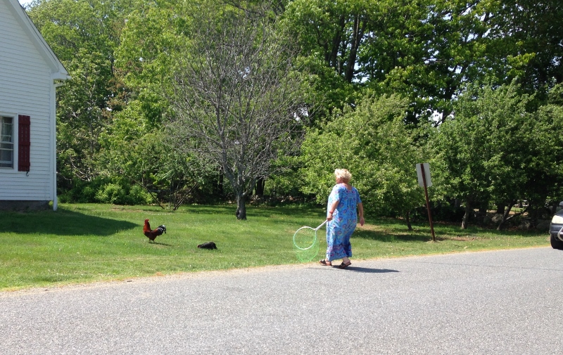 And yes, we have the answer to, “why did the chicken cross the road?” In this case it’s because the road cuts through the 20-plus acres and for some reason the owners put the chicken ranch across the road from the house. Mostly I think the reason is that the other hens and the rooster gang up on one and she needs to flee fast!