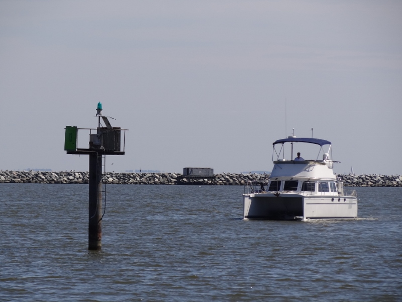 Russ arrives at Herrington Harbor North on Twin Sisters as I wait on Traveling Soul with Mike and Ann