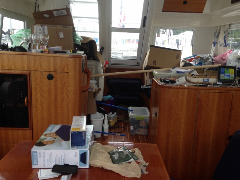We slowly moved aboard, making space and storing things in strange places as we went. The rain and wind-filled front that preceded Joaquin kept us inside for several days with claustrophobia a given what with all that stuff piled up. Of course we had to order stuff, mostly from Defender but Amazon was there too. Boy aren’t they slow now? Russ tried to do Prime, but long story short, it wasn’t going to work due to the marina having a physical shipping address AND a PO box.