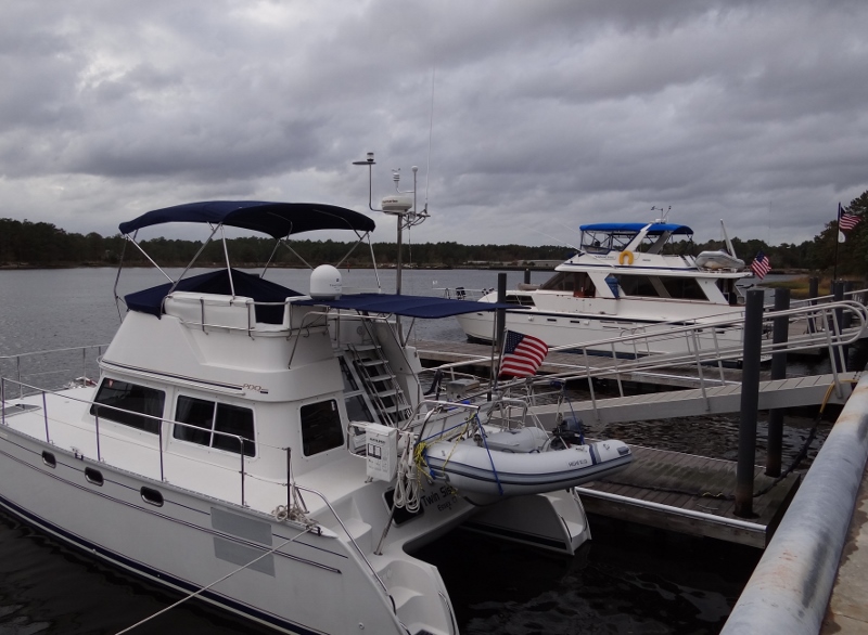 The once little-known new mooring field at Carolina Beach is now popular and we picked up the last of nine (but room for a few more!!) mooring balls. Rain, rain and more rain kept us aboard but since best-ever Britt’s Donuts is closed for the season, why bother going ashore? Notice that we haven’t used our new dinghy yet?
