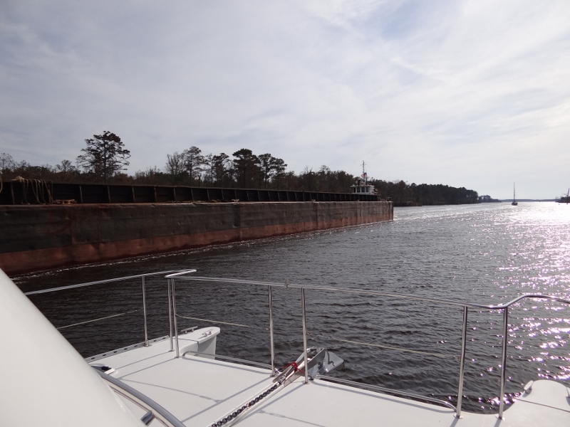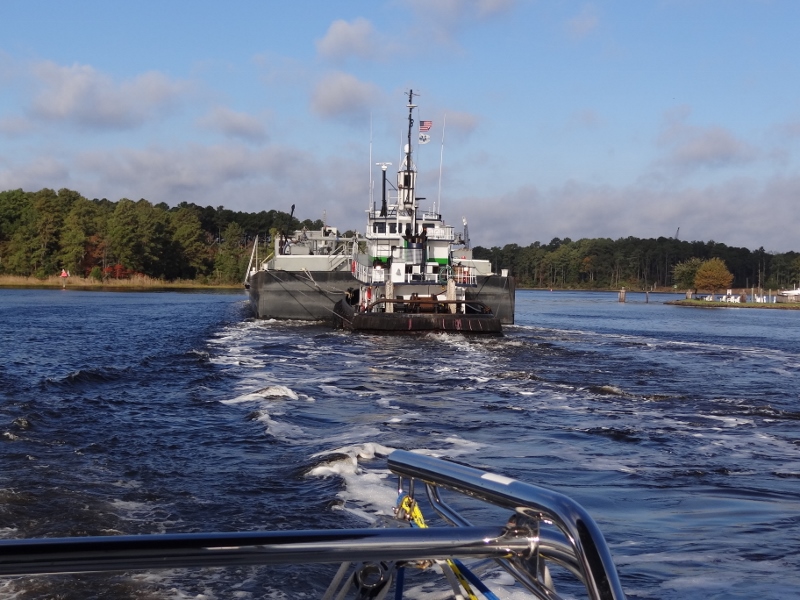 Because we are a small boat, even 17ft of width (beam) doesn’t keep us from rockin’ and rolling when waves come at us broadside. Our solution is to do a PDQ maneuver and speed up from our usual 8kts to 12-13kts. At that speed we are on plane and zooming over the wave tops so they don’t have a chance to push us around! Had to cross Albemarle Sound that way, but moseying down the Alligator-Pungo Canal was about as calm and leisurely as you would want.