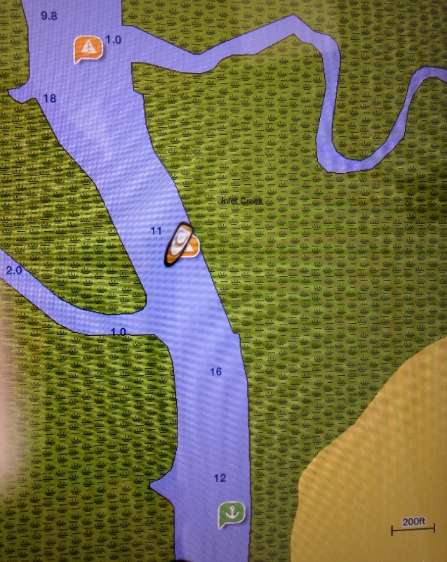 The Captain had warned that if we had to anchor at all close to the hazard he was going to use the old anchor that we still had tucked away in a bow locker. I voted (more like pleaded) for dropping the shiny hook before the other boats but Russ would have none of that. So he turned the flybridge helm over to his trusty albeit nervous Admiral to motor slowly in, past the anchored boats, wave nicely, maintain position, then spin around and slowly head for the middle of the creek. While I am doing this, he dives into the locker, brings up anchor and rode and rigs up a way to drop it in, bring it to center and put on a bridle once the anchor has set. Thank goodness for very low wind and since I’d handled the helm like this, oh maybe 2 or 3 times, sure, no sweat. The throttles are smooth as glass and a pleasure to use and with the help of eyeballs and a zoomed-in chart view we managed to anchor dead center. All good, right? But looked how “well” we did :