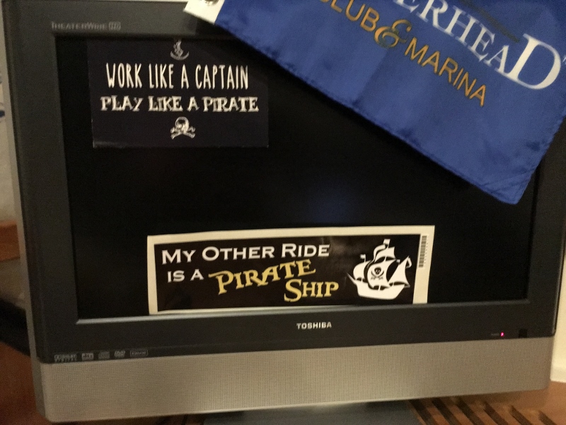 The captain says it’s safe to turn on viewing devices behind your seat; say what? Behind your seat? Yes, turn around and see the nice TV screen behind you. So, tonight’s show looks to be… ummm about pirates, or captains playing like pirates- I don’t know; very confusing these modern shows.