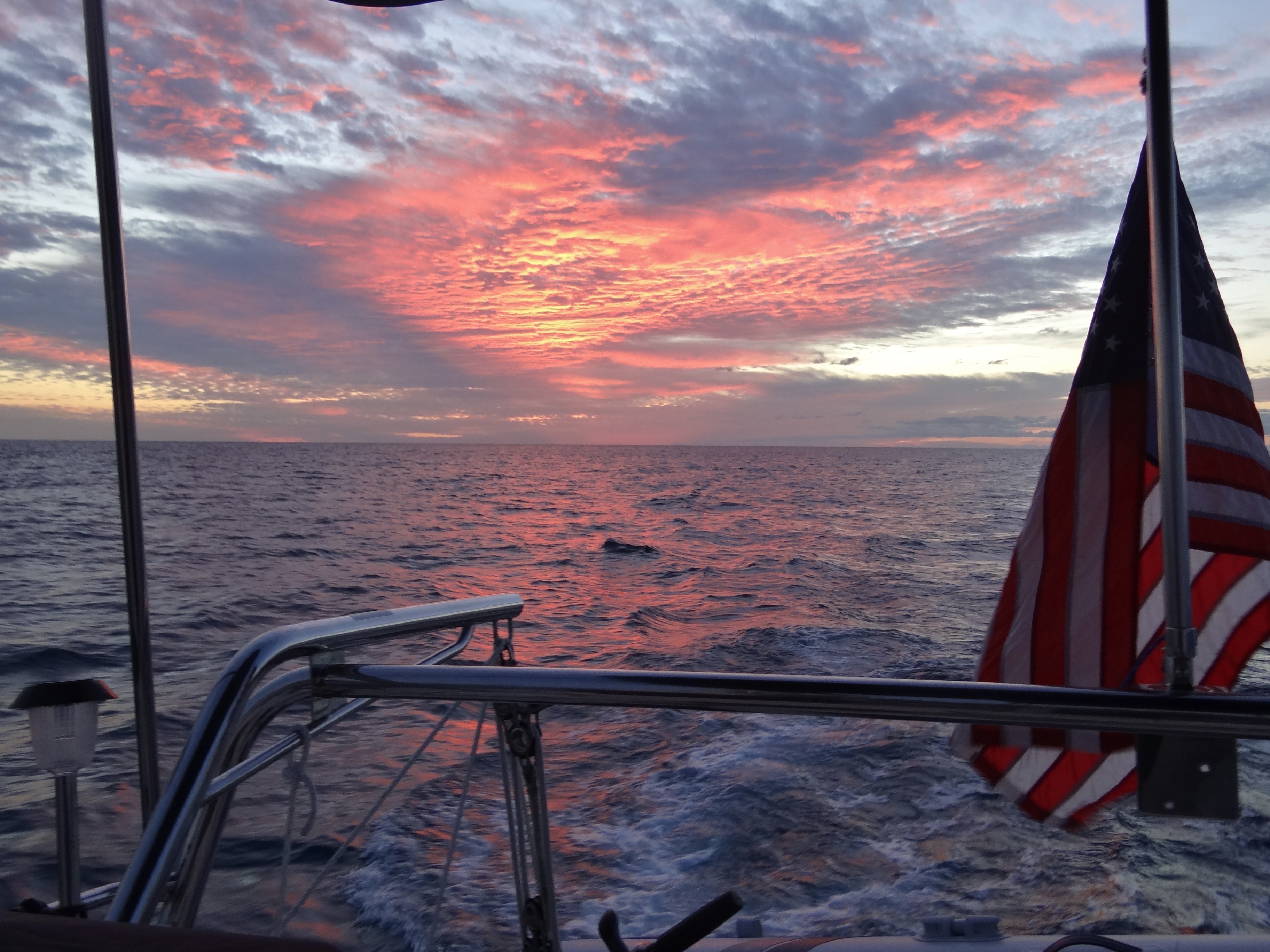 The worst was the last 5 hours and once dawn started to break, we sped up to alleviate some of the wave slapping, rocking and creaking we (Russ) had gotten very weary of. Speaking of weary…. Yes we were tired, yes we tried to sleep, yes it was too noisy. The bed sits on top of the 100hp engine, the waves hit the sides and underneath because we don’t have much of what is called bridge deck clearance (Twins has at least one foot less than Ortolan), and well there’s the creaky, squeaky thing. Russ managed a few hours total while I kept watch (Otto works well on Twins) but I chose to rest on the small sofa across from the helm and dozed a bit. The one positive guarantee with an overnight is that we both sleep soundly the next night.