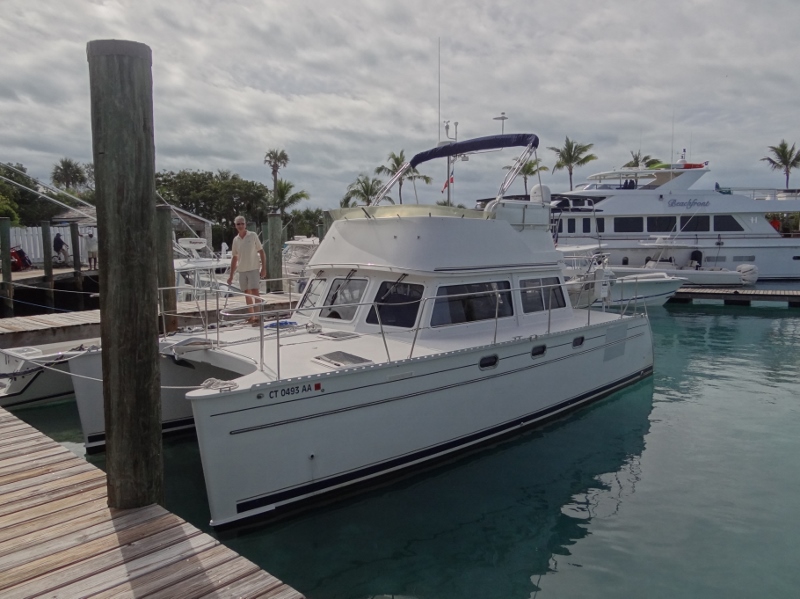 Twins got the typical Bahamian spider-web tie in the slip, plus an additional line tied between us and the sailboat next to us on our left. The fixed finger pier was on our right.