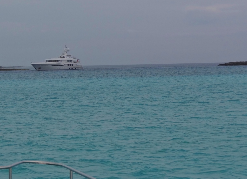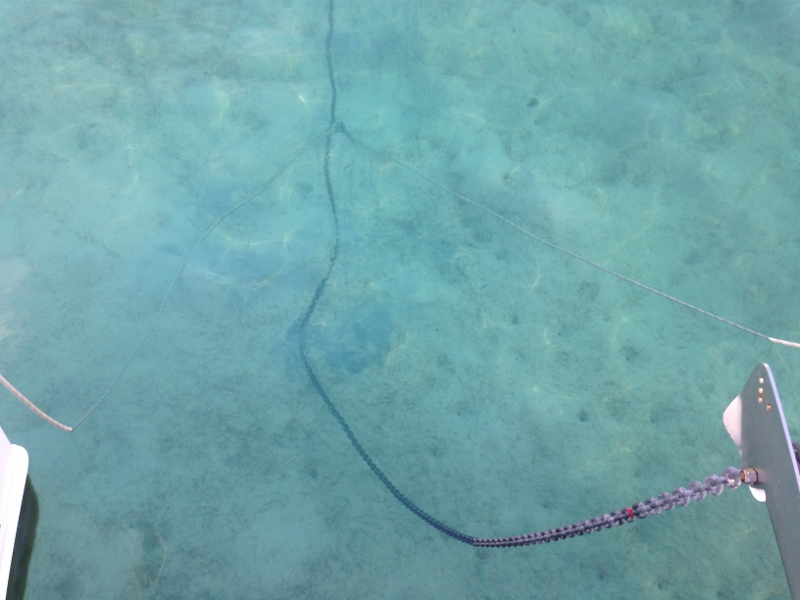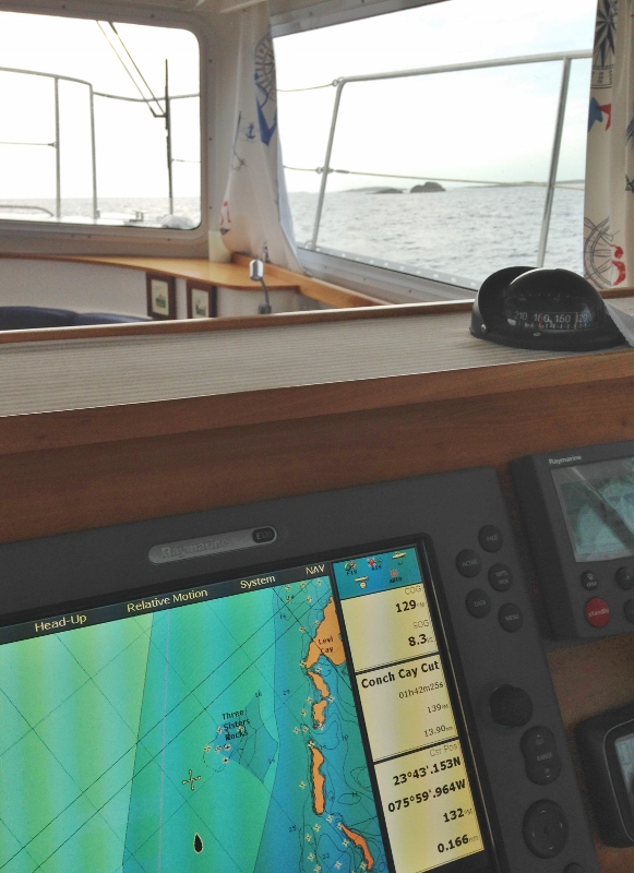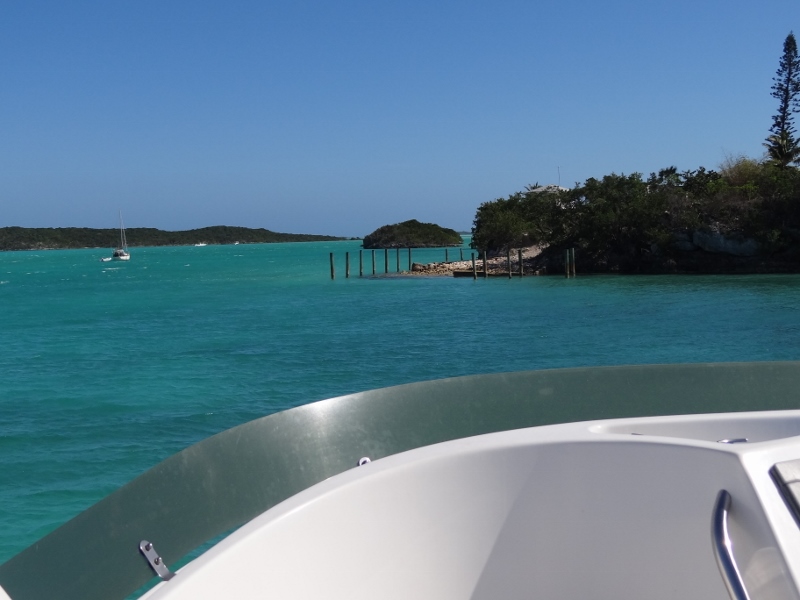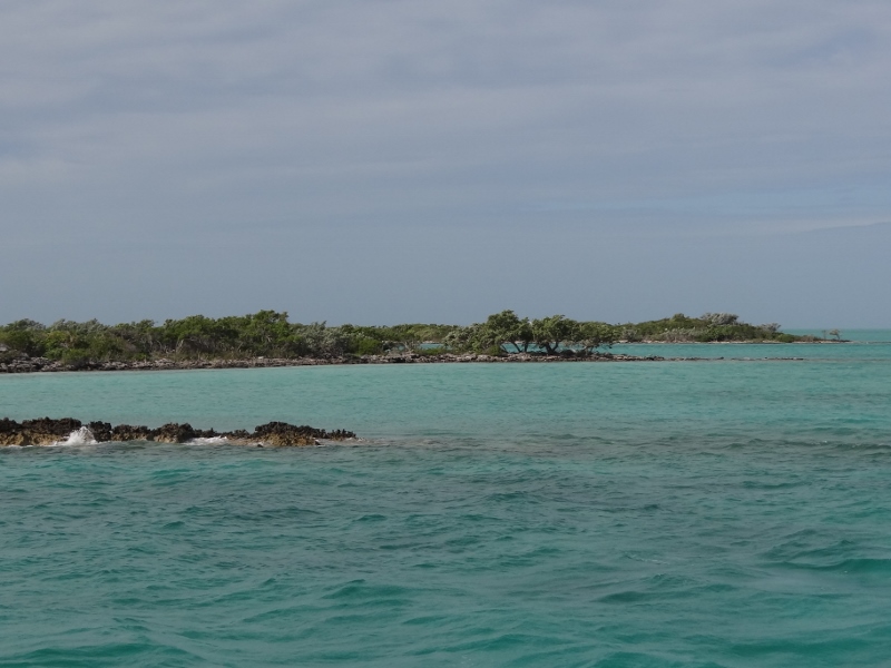 The day’s trip had been windier than we would prefer but about 30mins after we anchored the wind backed down and over the next few hours we watched several boats enter Rat Cay Cut, heading north. All night the wind behaved and we awoke to 5kts out of south. (we don’t have a means to know the direction for sure, but our flags provide a reasonable clue and when sailboats are close enough we look at the wind instrument on their mast top). This was better than hoped for and after breakfast we raised that shiny anchor and that Maggi chain and took off for Rat Cay Cut. The cut faces NNW and with wind out of the south, it was smooth like we’ve never seen any Bahamas cut.
