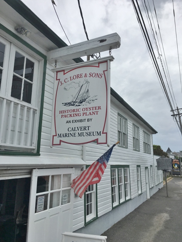 After lunch, keeping an eye on the sky for rain, we got in a quick harbor tour then tied up at a town dock on Solomons Island. We found the usual: a few shops, eateries, pubs, ice cream but also the J.C. Lore Oyster Packing Plant now owned by the Calvert Museum.