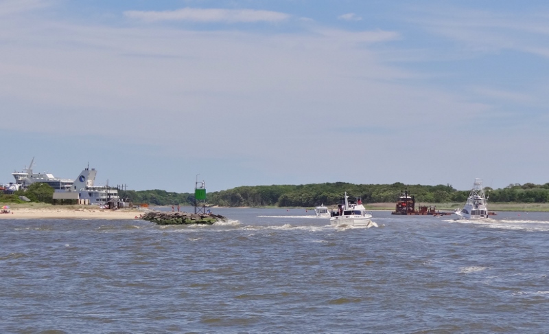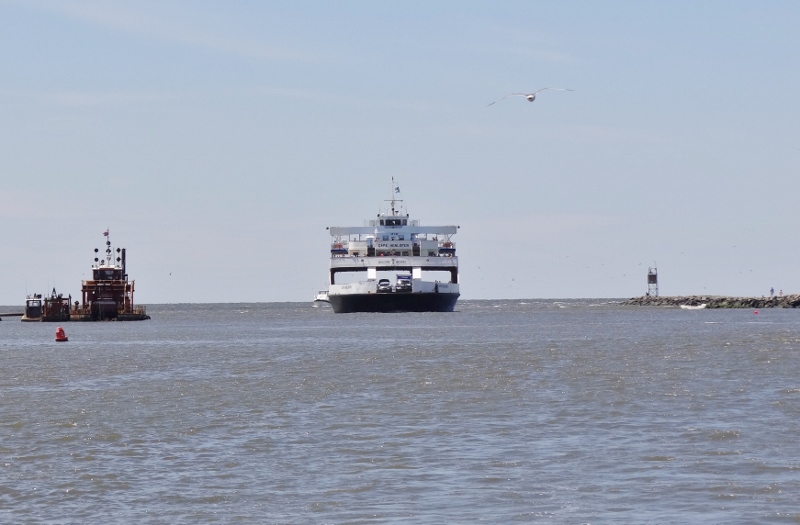 Across the river from Cape May is Lewes, Delaware and the large ferries run regularly back and forth. A dredge is working across from the Cape May ferry dock, hopefully making transit better for all boaters, so the smart if not cautious boat waits outside the jetties if a ferry is about to depart or enter. Yes that was us and a couple of others. Boy that ferry terminal is impressive.