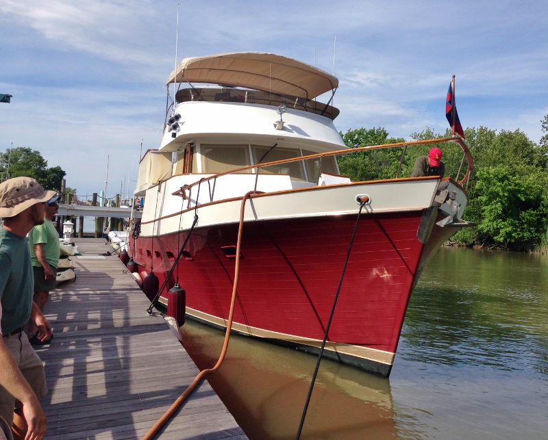 Sunday geared up to be quite the windy gusty day as confirmed by the crazy boats out in it; at least 8 arrived to join us. No rain with this front so walking around town and out to the edge of the river was doable. A pretty Trumpy, m/y Aurora IV (68ft built 1955) slid in to her spot like “what wind and current?” We’d seen her around and her sister too, m/y Enticer.