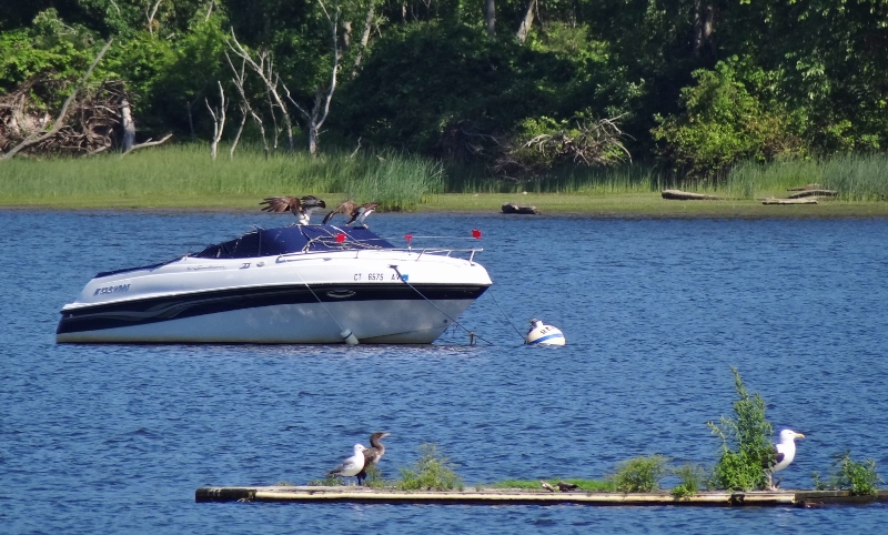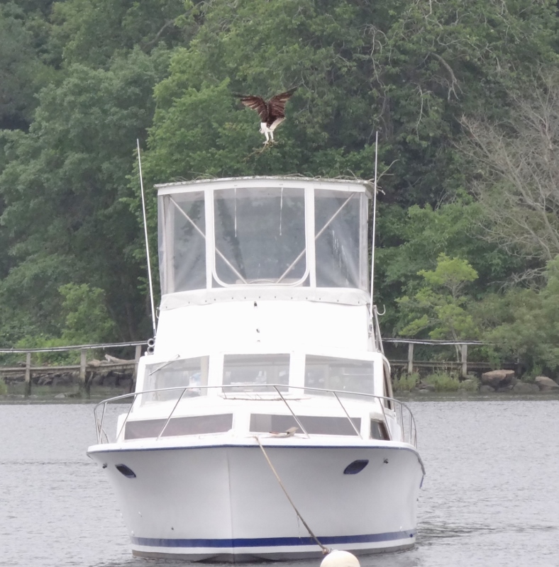 The osprey families were active, the young ones practicing nest building, fishing and flying every day. Had several landings on our bimini top accompanied by large stick donations. Two boats near us were heavily favored by osprey and even though the boats got used, the osprey never gave up.