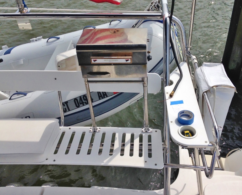 The stern bench seat is a good place to sit when you want to be outside but it’s too windy for the flybridge. With only bottom seat cushions it wasn’t very comfy as the backboard was a tad hard, as you can imagine. Russ decided- ah yes another project- to move the grill. It had been placed on the left side (looking at this photo) on the stand it came with, cable ties secured it to the bench seat. One of our two propane tanks had to be next to the grill. The setup worked but it was sloppy. Russ moved the grill to the right side of the bench seat while we were at Herrington Harbor, and that seat cushion is now in storage.